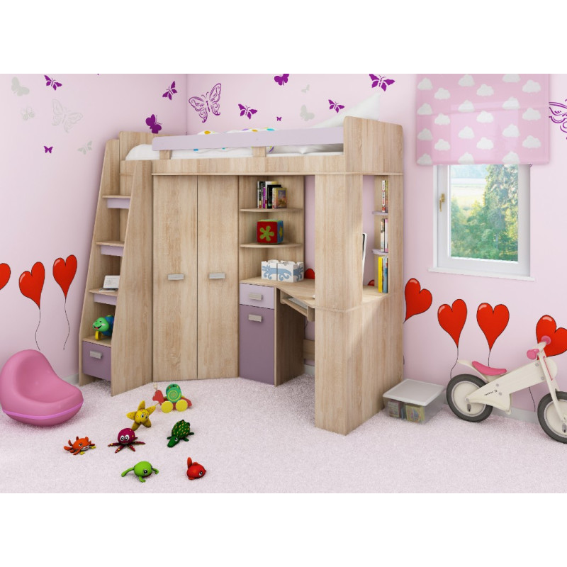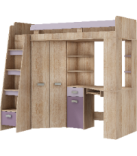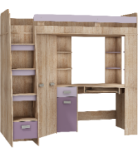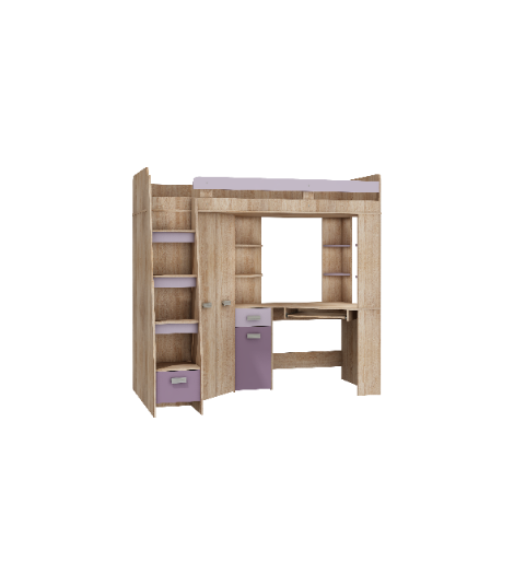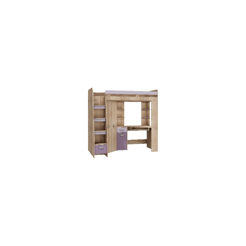 Łóżko piętrowe Antresola L z biurkiem i szafą Sonoma jasna/Lawenda/Fiolet