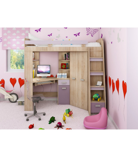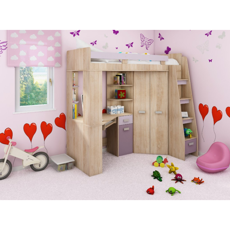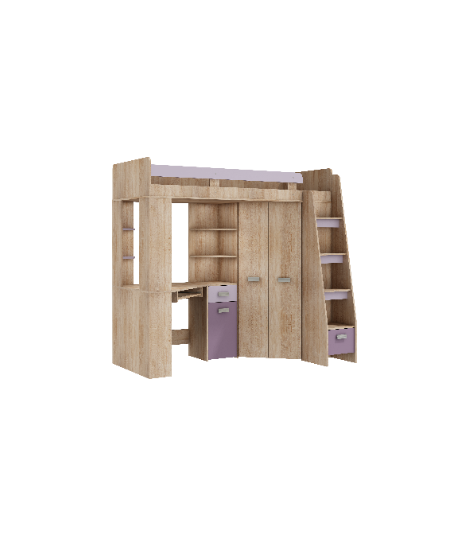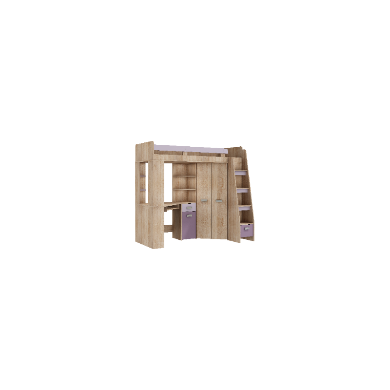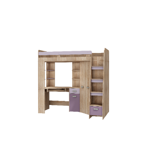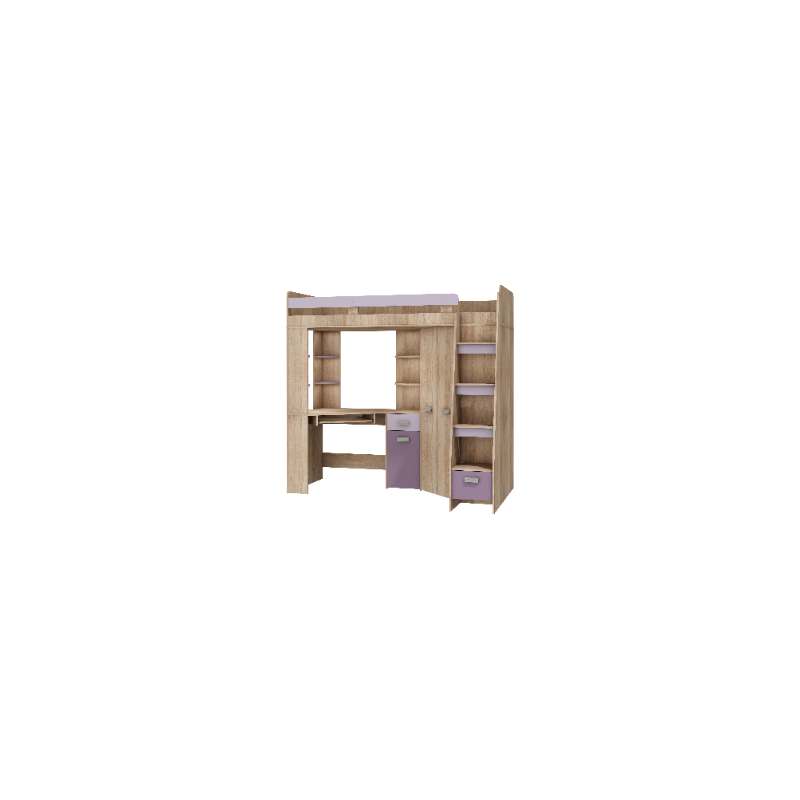 Łóżko piętrowe Antresola P z biurkiem i szafą Sonoma jasna/Lawenda/Fiolet