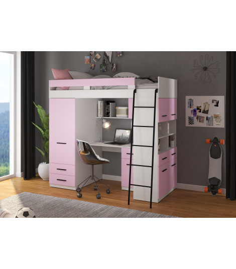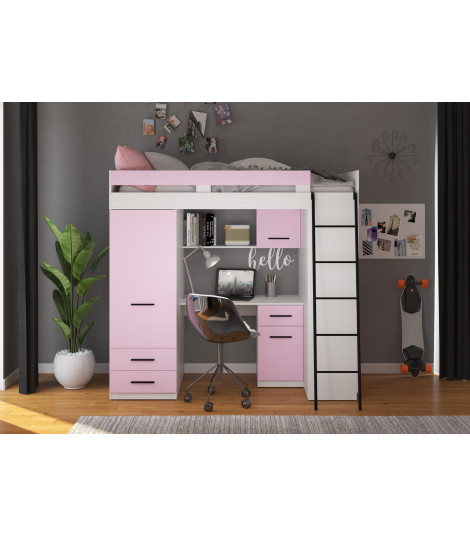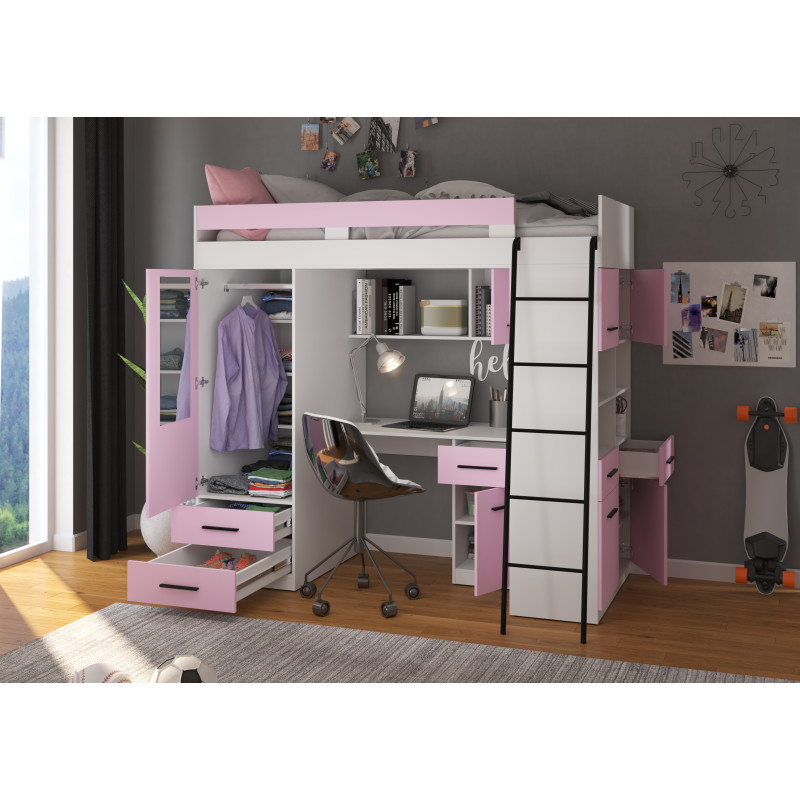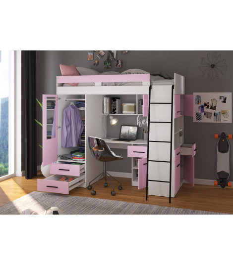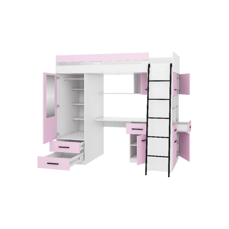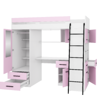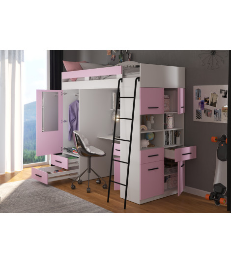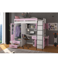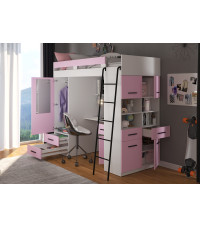 Łóżko piętrowe Level P z biurkiem i szafą Biały/Lawenda