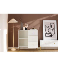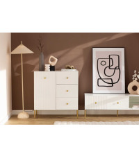 Cechą wyróżniającą kolekcji Oxo jest piękny, ryflowany front, który dodaje charakteru oraz oferuje atrakcyjną alternatywę do tradycyjnych, gładkich powierzchni. Złote, proste, metalowe nóżki nadają meblowi lekkość i elegancję, a także ułatwiają czyszczenie podłogi pod meblem. Uchwyty są okrągłe i gładkie, co umożliwia łatwe otwieranie, nie zostawiając przy tym żadnych zabrudzeń ani śladów na estetycznym froncie.