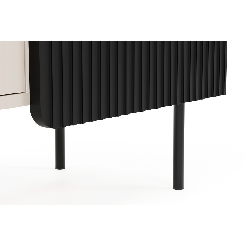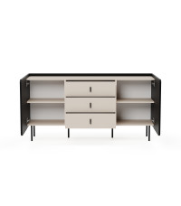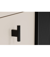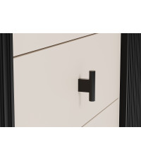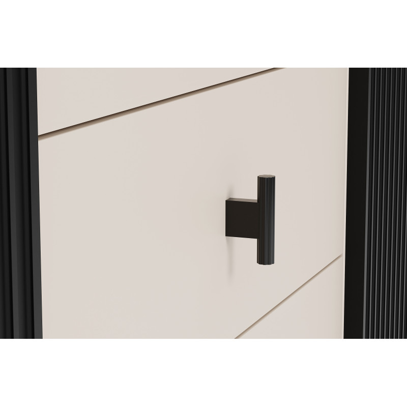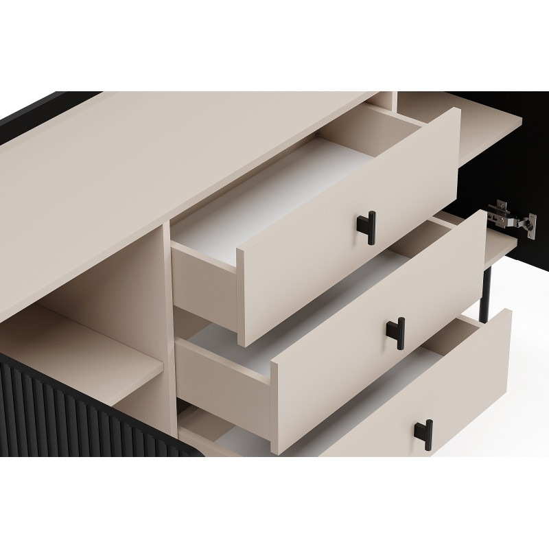 Komoda Wenus została wyposażona w trzy przestronne szuflady, które oferują dużo miejsca na przechowywanie. Fronty szuflad, w kolorze kaszmiru, idealnie współgrają z czarnym korpusem i nadają całości lekkości oraz subtelnej elegancji. Szuflady są nie tylko funkcjonalne, ale także estetyczne, a ich pojemność pozwala na przechowywanie różnych przedmiotów – od ubrań, przez dokumenty, po drobiazgi codziennego użytku.