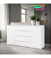 Komoda Cosmo C06 składa się z czterech szuflad oraz dwóch szafek przedzielonych półką. Mebel został wykonany z wysokiej jakości płyty laminowanej, która charakteryzuje się zwiększoną odpornością na zarysowania i uszkodzenia. Dodatkowo, krawędzie mebla zostały zabezpieczone obrzeżem ABS, co podnosi jego trwałość. Cosmo to nowoczesny system mebli, idealny dla każdego młodego człowieka. Bezuchwytowe fronty ułatwiają codzienne użytkowanie, czyniąc je bardziej komfortowym i mniej wymagającym. Zarówno front, jak i korpus komody wykonane są z płyty laminowanej o grubości 16 mm. Komoda dostępna jest w kolorze białym. Zalety produktu: Krawędzie mebla zabezpieczone obrzeżem ABS System bezuchwytowy Wytrzymałość i solidne wykonanie