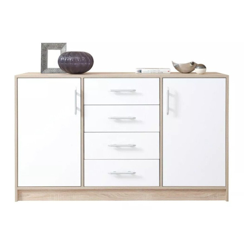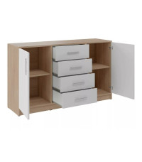 Przedstawiamy Państwu dużą komodę Smart SRK1, która doskonale sprawdzi się w przedpokoju, garderobie lub sypialni. Dzięki swojej prostej formie i uniwersalnej kolorystyce idealnie wpasuje się w każde wnętrze, nadając mu wyjątkowy charakter. Komoda wyróżnia się wysoką funkcjonalnością, zapewniając mnóstwo miejsca na przechowywanie ubrań i innych przedmiotów. Po bokach znajdują się dwie szafki, każda wyposażona w jedną półkę, co pozwala na wygodne rozmieszczenie rzeczy. W centralnej części komody umieszczono cztery praktyczne szuflady, które świetnie sprawdzą się jako schowek na bieliznę, skarpetki i inne drobne akcesoria.