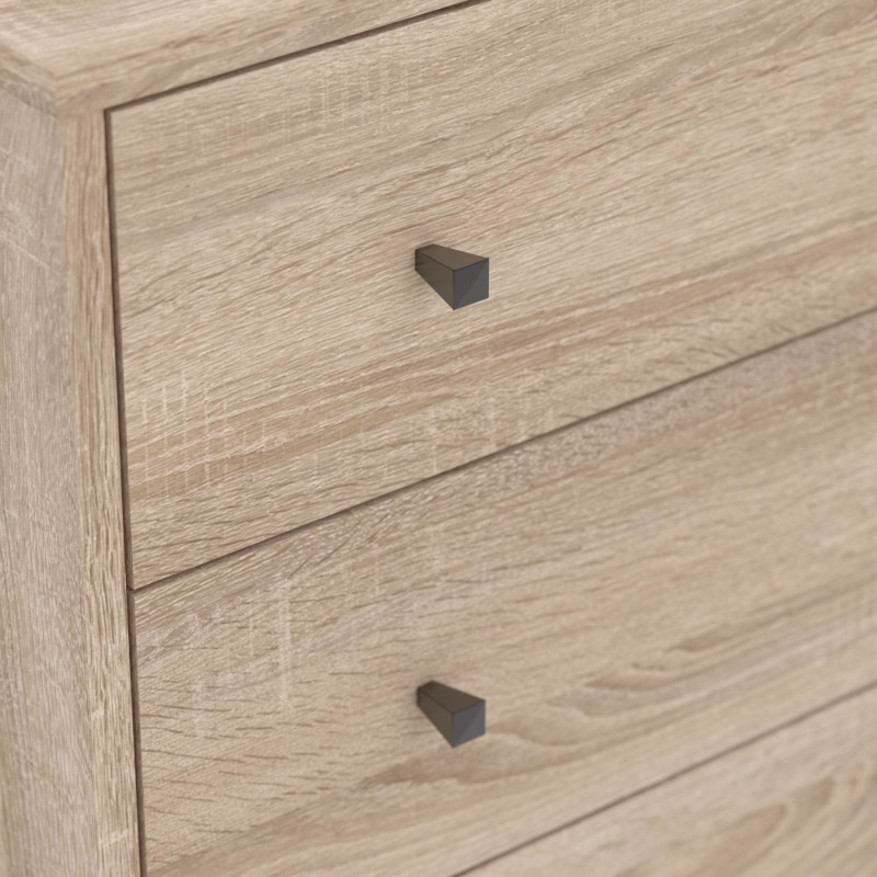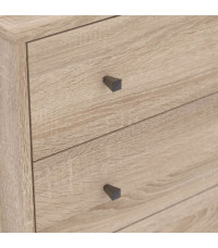 Komoda w dekorze dąb sonoma to połączenie funkcjonalności z elegancją, które odmieni Twoje wnętrze. Wykonana z trwałej płyty laminowanej, ma ciepły, naturalny odcień, który doskonale komponuje się z nowoczesnym stylem. Czarne uchwyty typu gałka i czarne nogi tworzywowe nadają jej subtelnego, ale wyrazistego charakteru. Dzięki przestronnym szufladom, montowanym na solidnych prowadnicach rolkowych, komoda oferuje wygodne przechowywanie. Idealna do salonu, sypialni czy przedpokoju, ta komoda to doskonały wybór, który łączy estetykę z praktycznością.
