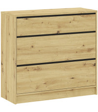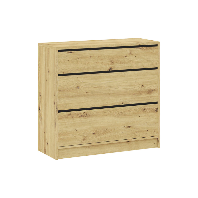 Komoda BASIT 3S w kolorze dąb artisan to mebel, który wprowadzi do Twojego wnętrza ciepło i naturalny urok drewna. Trzy pojemne szuflady zapewniają dużą przestrzeń do przechowywania, a brak uchwytów i frezowane fronty nadają jej subtelnego, ale eleganckiego charakteru. Doskonała do sypialni, salonu czy przedpokoju, komoda łączy funkcjonalność z estetyką, idealnie komponując się w różnych stylach wnętrz.