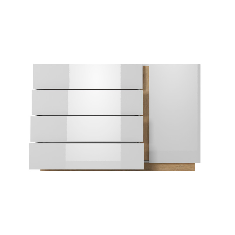 Korpus komody wykonano z laminowanej płyty wiórowej o grubości 16 mm w kolorze białym i dekorze dębu Grandson, odpornym na wilgoć i zarysowania. Fronty zostały wykończone na wysoki połysk, co dodaje meblowi elegancji i nowoczesnego charakteru. Zastosowany system push-to-open pozwala na wygodne otwieranie drzwi bez uchwytów, a zawiasy z cichym domykiem zwiększają komfort codziennego użytkowania. Obrzeża zostały zabezpieczone trwałym materiałem ABS, a tył mebla wykonano z solidnej płyty HDF. Mebel opiera się na cokole z płyty, wzmocnionym plastikowymi ślizgami, co zapewnia jego stabilność i chroni podłogę. Komoda idealnie sprawdzi się jako miejsce do przechowywania tekstyliów, dokumentów lub innych domowych drobiazgów. Wymaga montażu do ściany zgodnie z instrukcją producenta.