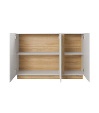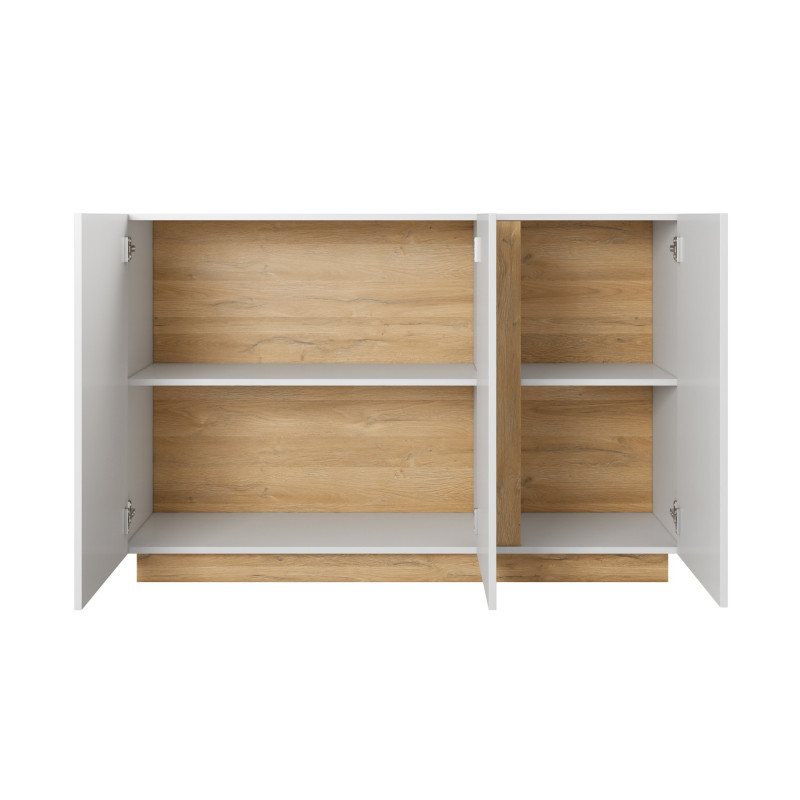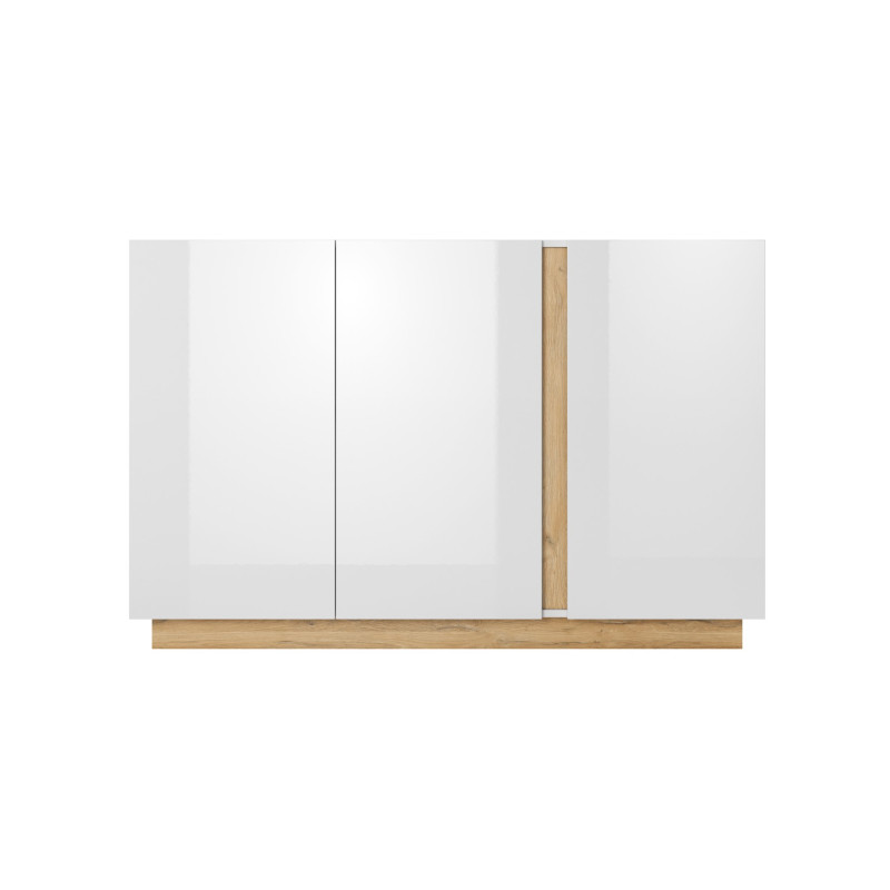 Komoda Arco 138 z trzema frontami to uniwersalne i eleganckie rozwiązanie do nowoczesnych wnętrz. Minimalistyczny design w białym połysku z subtelnym dodatkiem dębu Grandson doskonale odnajdzie się zarówno w salonie, jak i jadalni. Mebel łączy prostotę formy z funkcjonalnością, oferując sporo miejsca do przechowywania.