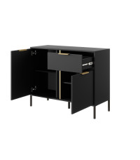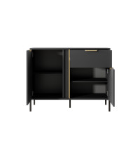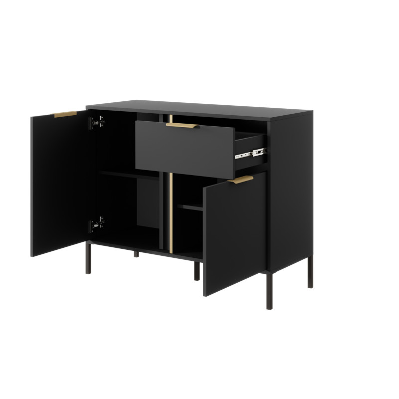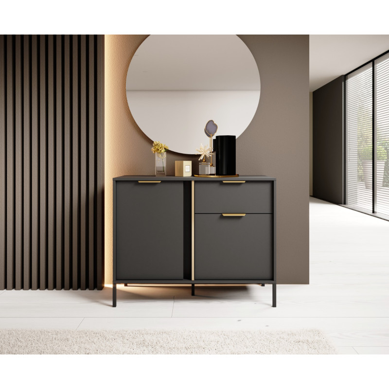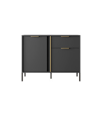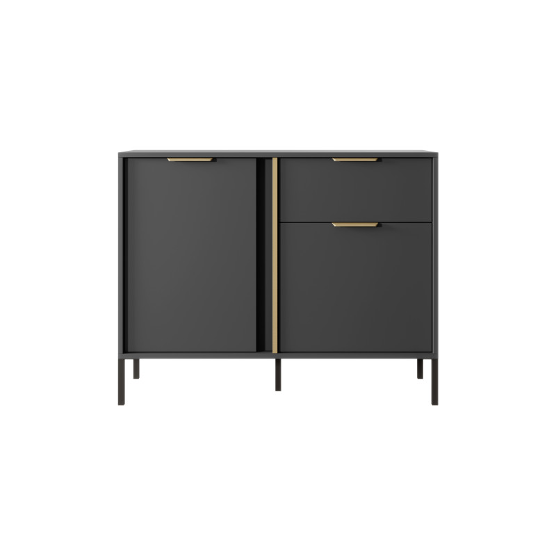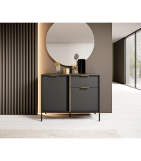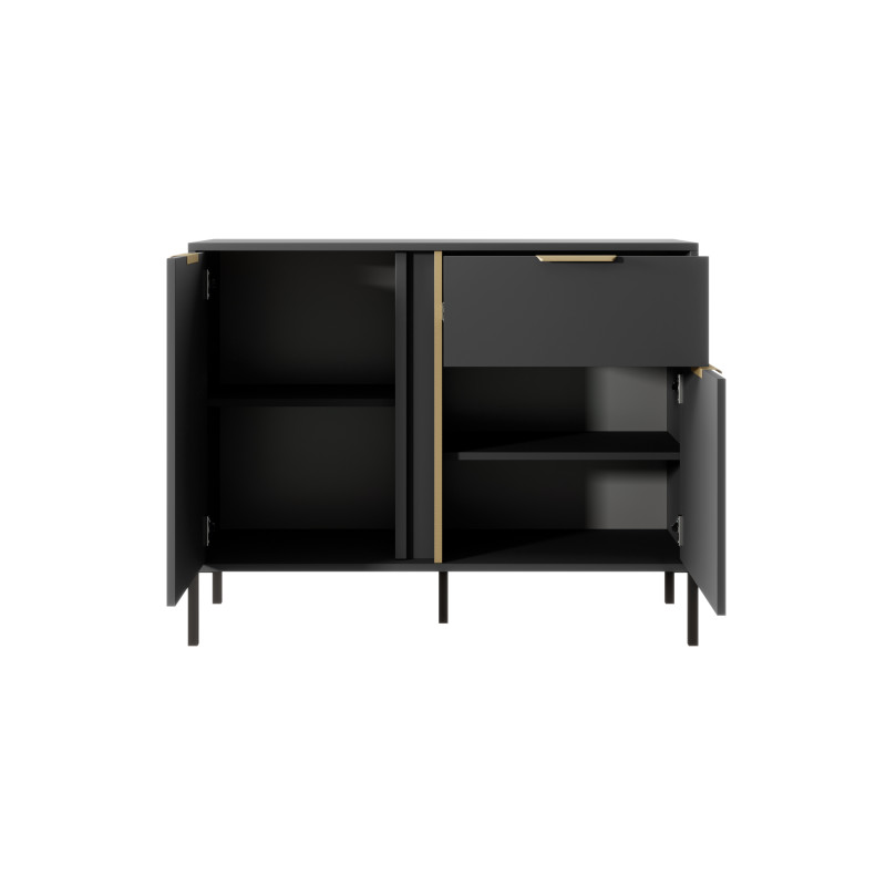 Komoda D to stylowy mebel w głębokim antracycie ze złotymi detalami, który doda charakteru każdemu wnętrzu. Dzięki połączeniu dwóch drzwi i jednej szuflady zapewnia praktyczne miejsce do przechowywania. Idealna do salonu, gdzie łączy funkcjonalność z nowoczesnym designem.