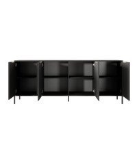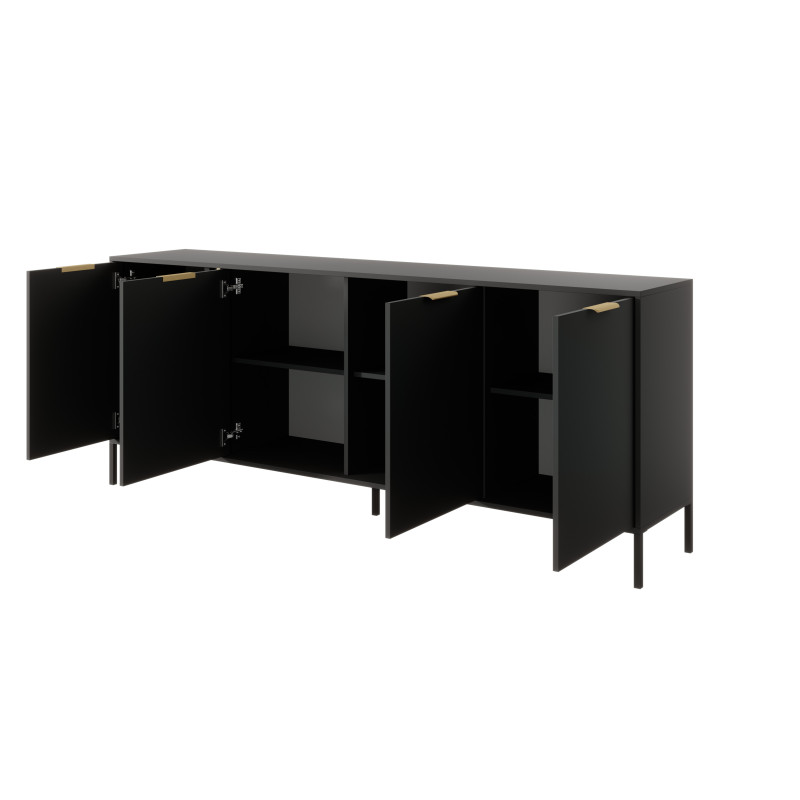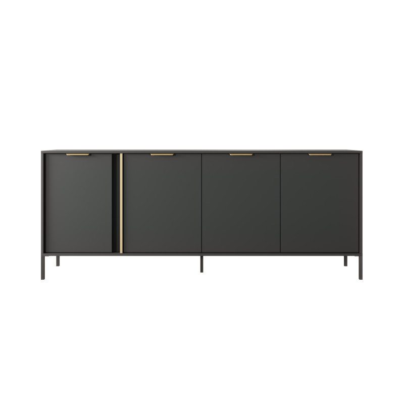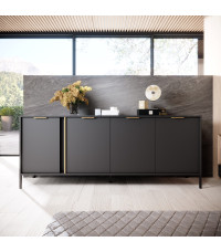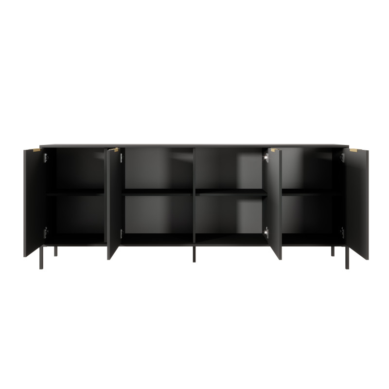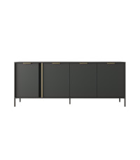 Komoda E to nowoczesny mebel w antracytowym kolorze z eleganckimi złotymi akcentami, który znakomicie uzupełni strefę dzienną. Cztery pojemne drzwi zapewniają dużo miejsca do przechowywania, pomagając utrzymać porządek w salonie. Stylowa i funkcjonalna – idealna do nowoczesnych wnętrz.