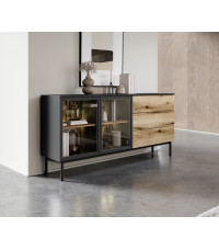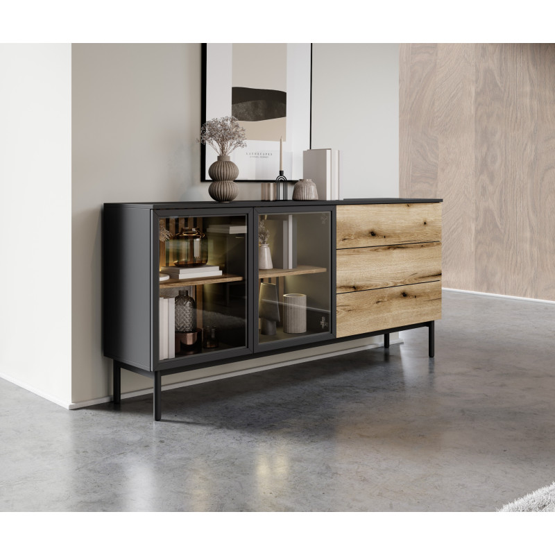 Komoda Lang 180 2d3s to doskonała opcja do przestronnych wnętrz, oferująca dużą przestrzeń do przechowywania w eleganckim wydaniu. Połączenie czarnego korpusu z detalami w kolorze dąb evoke tworzy nowoczesną, ciepłą atmosferę w Twoim wnętrzu. Dzięki systemowi push-to-open oraz oświetleniu LED, komoda łączy funkcjonalność z estetyką, będąc idealnym rozwiązaniem do salonu czy jadalni.