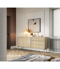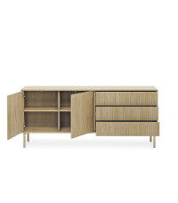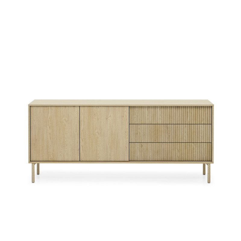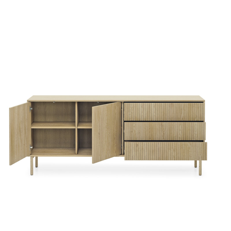 Komoda 187 2d3s z serii Tavo wykonana jest z laminowanej płyty wiórowej w kolorze dąb cremona, co zapewnia trwałość i estetyczny wygląd. Fronty z ryflowanej płyty MDF 18 mm oraz płyty wiórowej w tym samym kolorze uzupełniono elementami HDF w odcieniu dąb sonoma, które nadają meblowi naturalny charakter. Obrzeża z tworzywa ABS dopasowano kolorystycznie do całej konstrukcji, a brak uchwytów i system push-to-open dodają lekkości i wygody użytkowania. Komoda ma szerokość 187,1 cm, wysokość 79,8 cm i głębokość 39,5 cm, oferując dużo miejsca na przechowywanie. Szuflady wyposażono w prowadnice kulkowe z pełnym wysuwem, które zapewniają płynne i ciche otwieranie. Stabilne, drewniane nogi nadają całości naturalnego i ponadczasowego wyglądu. Ten model świetnie wpisuje się w nowoczesne, jasne wnętrza, które cenią funkcjonalność i estetykę.