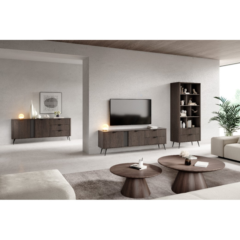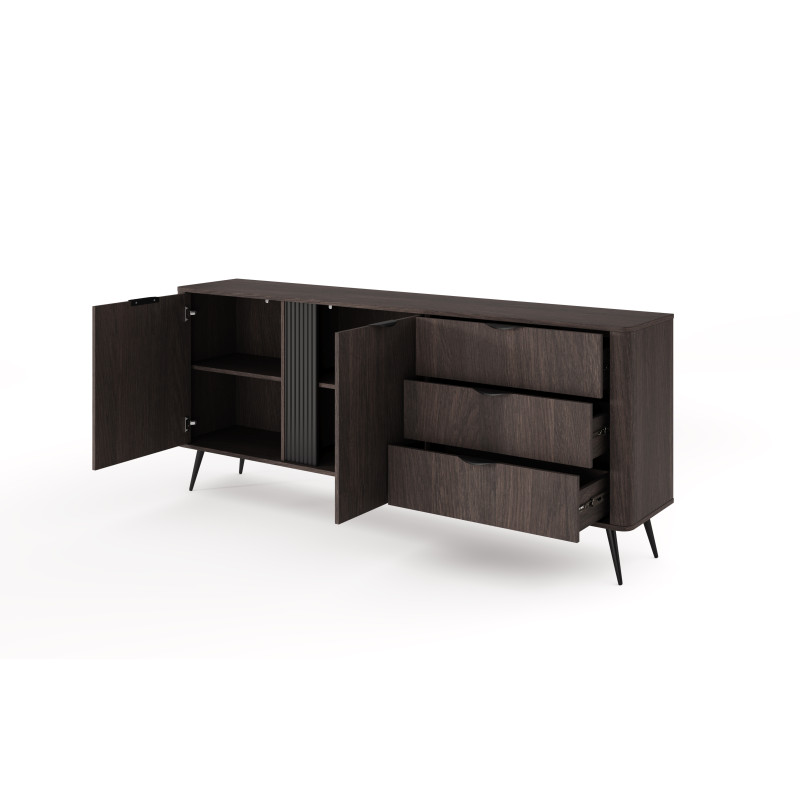 Komoda 195 2d3s z serii Veris ma szerokość 195,2 cm, wysokość 81,2 cm i głębokość 38 cm, oferując sporo przestrzeni na przechowywanie różnych przedmiotów. Konstrukcja wykonana jest z laminowanej płyty wiórowej E05 (16 mm) oraz ryflowanej płyty MDF 18 mm w kolorze dąb dunin, uzupełniona o czarne metalowe uchwyty i nogi, które dodają meblowi nowoczesnego charakteru. Szuflady z kulkowymi prowadnicami o pełnym wysuwie oraz drzwi z zawiasami bliźniaczymi gwarantują komfort użytkowania i trwałość na lata. Obrzeża ABS chronią krawędzie przed uszkodzeniami, a dopasowane do frontów HDF wzmacnia spójność stylistyczną. Ten mebel świetnie wpisze się w aranżacje łączące naturalne drewno z industrialnymi akcentami. Idealny do strefy dziennej, gdzie sprawdzi się zarówno jako miejsce do przechowywania, jak i dekoracyjny element wnętrza.