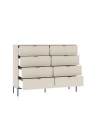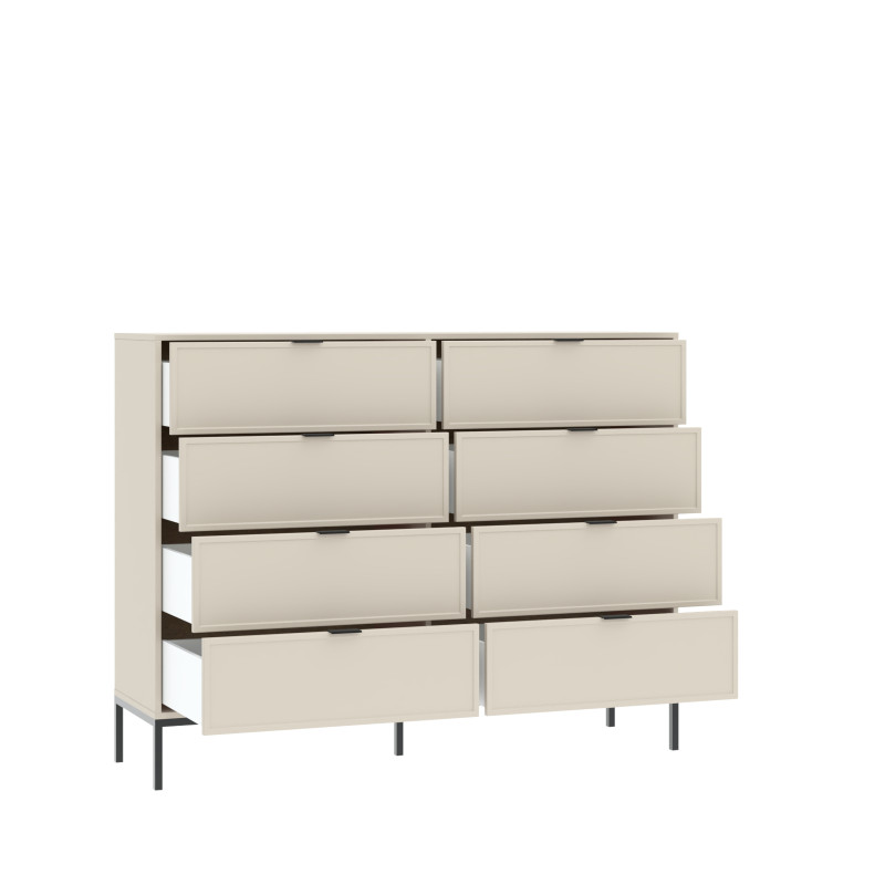 Komoda DECO 8S w kolorze kaszmir to idealne rozwiązanie dla tych, którzy cenią ład i porządek w eleganckim wydaniu. Osiem pojemnych szuflad, czarne detale i subtelna ramka tworzą harmonijną, nowoczesną całość. Mebel, który świetnie sprawdzi się zarówno w sypialni, jak i salonie.
