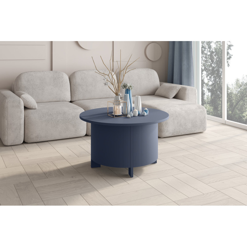 Ława SALVO w granatowym matowym wykończeniu to kwintesencja nowoczesnej elegancji i minimalistycznego designu. Jej okrągły blat i cylindryczna podstawa z delikatną strukturą prążków wprowadzają do wnętrza lekkość i styl. Idealna dla tych, którzy cenią połączenie funkcjonalności z wyjątkowym wyglądem.