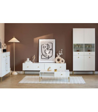 Cechą wyróżniającą kolekcji Oxo jest piękny, ryflowany front, który dodaje charakteru oraz oferuje atrakcyjną alternatywę do tradycyjnych, gładkich powierzchni. Złote, proste, metalowe nóżki nadają meblowi lekkość i elegancję, a także ułatwiają czyszczenie podłogi pod meblem. Uchwyty są okrągłe i gładkie, co umożliwia łatwe otwieranie, nie zostawiając przy tym żadnych zabrudzeń ani śladów na estetycznym froncie.