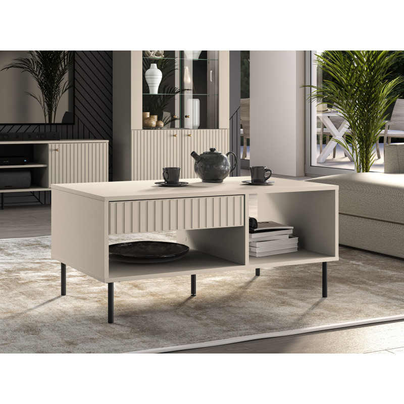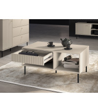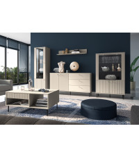 Meble z kolekcji Sophie to idealny wybór do współczesnego salonu czy sypialni. Dzięki systemowi złożonemu z jedenastu brył urządzisz swoje wymarzone wnętrze. Kaszmirowy dekor to niebanalny i ponadczasowy kolor, nazywany nowym białym. Frezowane fronty MDF podkreślają wyrafinowanie i elegancję całej kolekcji. Dyskretne czarne nóżki dodają bryłom efektownej lekkości. Kropką nad i, dodatkowo budującą estetykę wszystkich mebli Sophie są uchwyty ze szczotkowanego metalu, w złotym wybarwieniu.