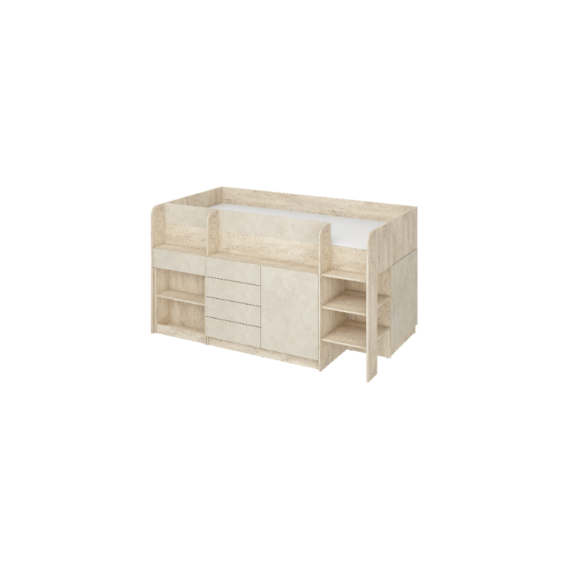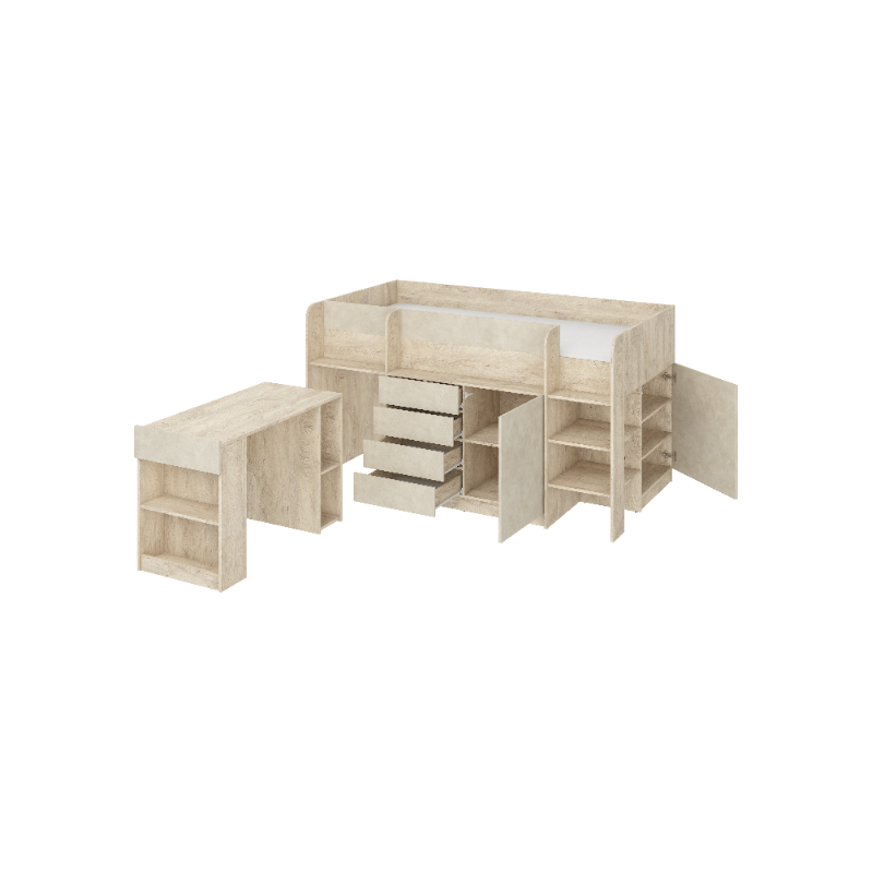 Łóżko piętrowe Smile od producenta Meblocross to doskonały sposób na oszczędzenie miejsca, które przyda się zwłaszcza w pokoju dziecka lub młodzieżowym. Smile to bryła wielozadaniowa, w której znajdziemy łóżko, a pod nim chowane biurko. Bryła została wyposażona również w pojemną szafę, która pomieści wszystkie niezbędne rzeczy, regał z półkami, a także kilka schowków, półek i szuflad. Łóżko można kupić w dwóch konfiguracjach (lewostronne lub prawostronne).