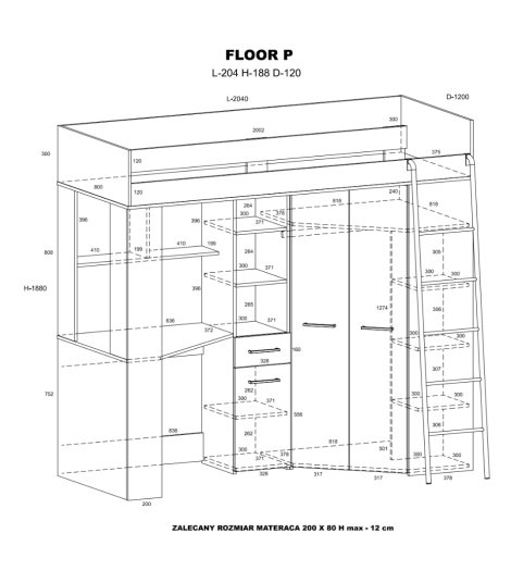 Łóżko piętrowe z biurkiem FLOOR P w kolorystyce Craft biały / grafit to mebel z prawostronnym układem, który łączy w sobie trzy funkcjonalne strefy: wygodne łóżko, praktyczne biurko oraz pojemną szafę z półkami i szufladami. Konstrukcja wykonana jest z trwałej płyty laminowanej o grubości 16 mm, z krawędziami zabezpieczonymi obrzeżem ABS, co zapewnia odporność na uszkodzenia. System cichego domyku podnosi komfort codziennego użytkowania. Mebel ma szerokość 204 cm, wysokość 188 cm oraz głębokość 120 cm, idealnie sprawdzając się w różnej wielkości pokojach. Produkt sprzedawany jest bez materaca – dedykowany model powinien mieć wymiary 200 × 80 × 12 cm.