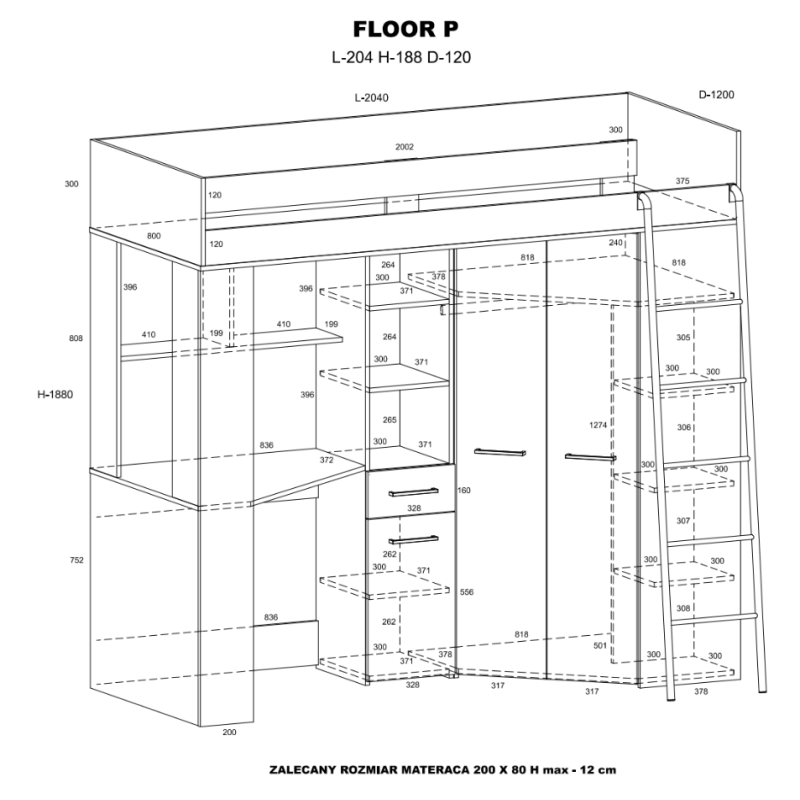 Łóżko Floor P Sonoma jasna/Biały to przemyślane połączenie estetyki i funkcjonalności, idealne do optymalnego zagospodarowania przestrzeni. Jego wymiary wynoszą 204 cm szerokości, 188 cm wysokości oraz 120 cm głębokości, co sprawia, że doskonale pasuje do różnych rozmiarów pomieszczeń. Konstrukcja wykonana jest z płyty laminowanej o grubości 16 mm, z trwałym obrzeżem ABS, które chroni przed uszkodzeniami. Mebel wyposażony jest w szafę z cichym domykiem, półki oraz biurko umieszczone pod łóżkiem, tworząc praktyczne miejsce do przechowywania i nauki. Łóżko posiada prawostronną konstrukcję i nie zawiera materaca, lecz dedykowany materac o wymiarach 200 x 80 x 12 cm będzie doskonałym uzupełnieniem zestawu. Dzięki jasnej kolorystyce Sonoma z białymi frontami wniesie do pokoju lekkość i świeżość, podkreślając nowoczesny charakter wnętrza.
