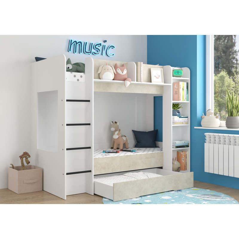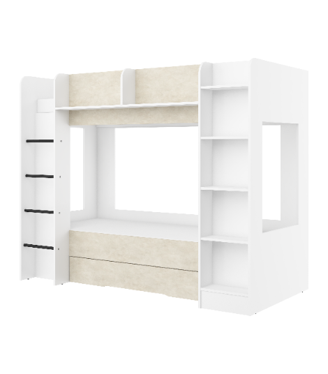 Łóżko piętrowe EVEREST L w kolorystyce Biały / Granada migdał to praktyczny mebel zaprojektowany z myślą o funkcjonalnym zagospodarowaniu przestrzeni w pokoju dwójki dzieci. Konstrukcja łączy dwa miejsca do spania, pojemną szufladę na pościel lub zabawki oraz wbudowany regał, który sprawdzi się jako miejsce na książki, dekoracje czy przybory szkolne. Mebel wykonany został z trwałej płyty laminowanej o grubości 16 mm, a jego obrzeża zabezpieczono wytrzymałym tworzywem ABS, co zwiększa odporność na codzienne użytkowanie. Łóżko przeznaczone jest dla materacy o wymiarach 200 × 80 × 12 cm i dostępne jest w wersji lewostronnej – drabinka może być zamontowana wyłącznie po lewej stronie. Model EVEREST L to idealne połączenie nowoczesnego designu, komfortu i praktyczności, które pozwala maksymalnie wykorzystać przestrzeń w dziecięcym pokoju. Świetnie sprawdzi się zarówno w mniejszych, jak i większych wnętrzach.