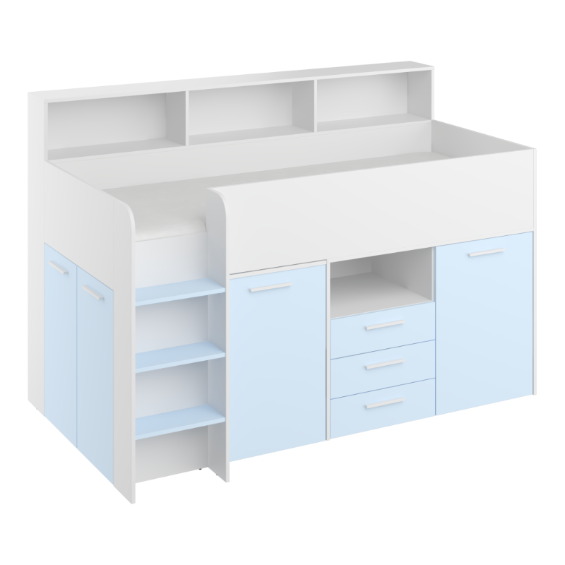 Antresola Neo L w wersji Biały/Błękit to niskie, lewostronne łóżko piętrowe o powierzchni spania 80 na 200 cm oraz wymiarach całkowitych: długość 206 cm, wysokość 138 cm i głębokość 120 cm. Wykonane z wysokiej jakości płyty laminowanej o grubości 16 mm, z obrzeżami ABS zwiększającymi odporność na wilgoć i uszkodzenia mechaniczne. Mebel wyposażono w zawiasy z cichym domykiem, co znacząco podnosi komfort użytkowania. Bezpieczna metalowa drabinka ułatwia dostęp do łóżka, a funkcjonalne wyposażenie obejmuje wysuwane biurko z dwiema szufladami i czterema półkami, cztery otwarte półki, pojedynczą szafkę z dwiema półkami oraz podwójną szafkę z trzema półkami. Neo L Biały/Błękit to doskonałe rozwiązanie dla każdego dziecka, które ceni wygodę i porządek w pokoju.