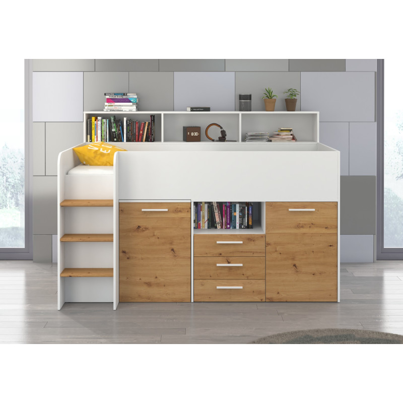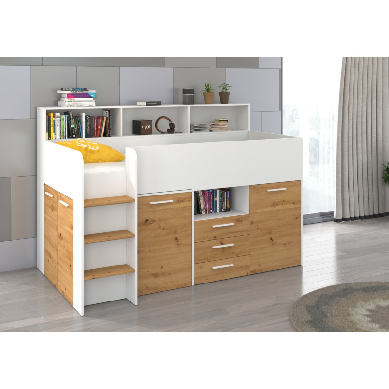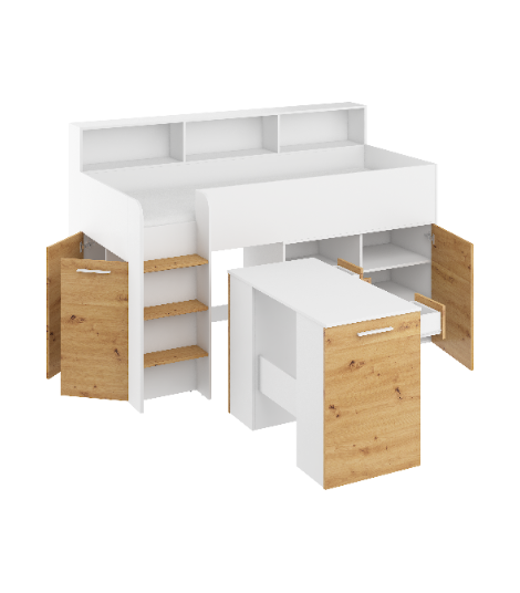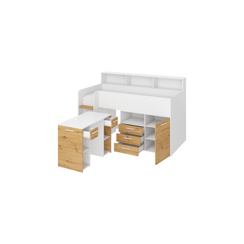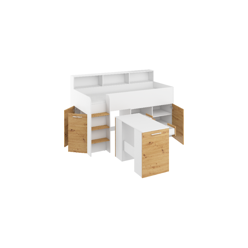 Antresola Neo L w wersji Biały/Dąb Artisan to niskie, lewostronne łóżko piętrowe o powierzchni spania 80 na 200 cm oraz wymiarach całkowitych: długość 206 cm, wysokość 138 cm i głębokość 120 cm. Mebel wykonano z wysokiej jakości płyty laminowanej o grubości 16 mm, zabezpieczonej obrzeżami ABS, które zwiększają odporność na wilgoć i uszkodzenia mechaniczne. Zastosowane zawiasy z cichym domykiem podnoszą komfort codziennego użytkowania. Metalowa drabinka zapewnia bezpieczny dostęp do łóżka. Wysuwane biurko wyposażone jest w dwie szuflady oraz cztery półki, co tworzy wygodną przestrzeń do nauki i zabawy. Cztery otwarte półki, pojedyncza szafka z dwiema półkami oraz podwójna szafka z trzema półkami zapewniają dużo miejsca do przechowywania. Neo L Biały/Dąb Artisan to idealne połączenie funkcjonalności i stylu.