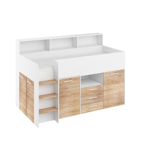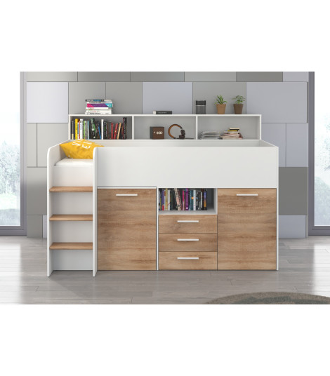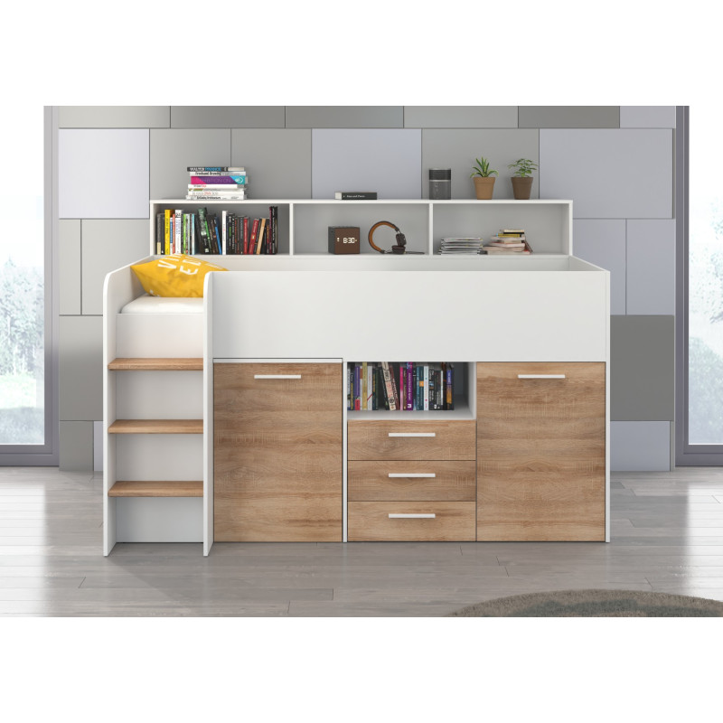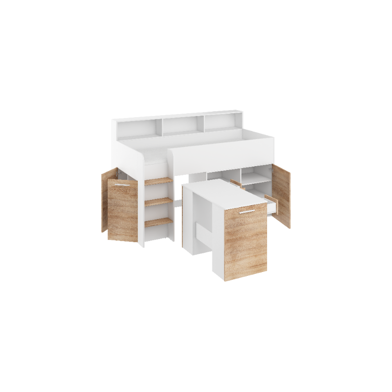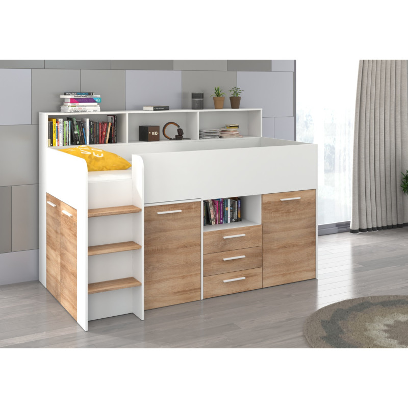 Antresola Neo L w wersji Biały/Sonoma jasna to niskie, lewostronne łóżko piętrowe o powierzchni spania 80 na 200 cm oraz wymiarach całkowitych: długość 206 cm, wysokość 138 cm i głębokość 120 cm. Konstrukcja wykonana z wysokiej jakości płyty laminowanej o grubości 16 mm, z obrzeżami ABS, które zwiększają odporność mebla na wilgoć i uszkodzenia mechaniczne. Zawiasy z cichym domykiem zapewniają komfort codziennego użytkowania. Metalowa drabinka gwarantuje bezpieczny dostęp do łóżka. Wysuwane biurko wyposażone w dwie szuflady i cztery półki stanowi wygodne miejsce do nauki, a cztery otwarte półki, pojedyncza szafka z dwiema półkami oraz podwójna szafka z trzema półkami oferują dużo przestrzeni do przechowywania. Neo L Biały/Sonoma jasna to połączenie funkcjonalności z naturalnym, przytulnym designem.