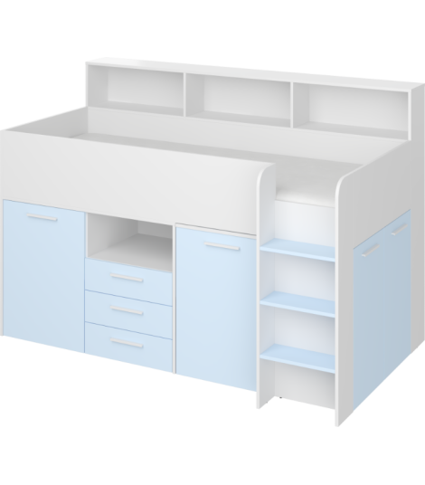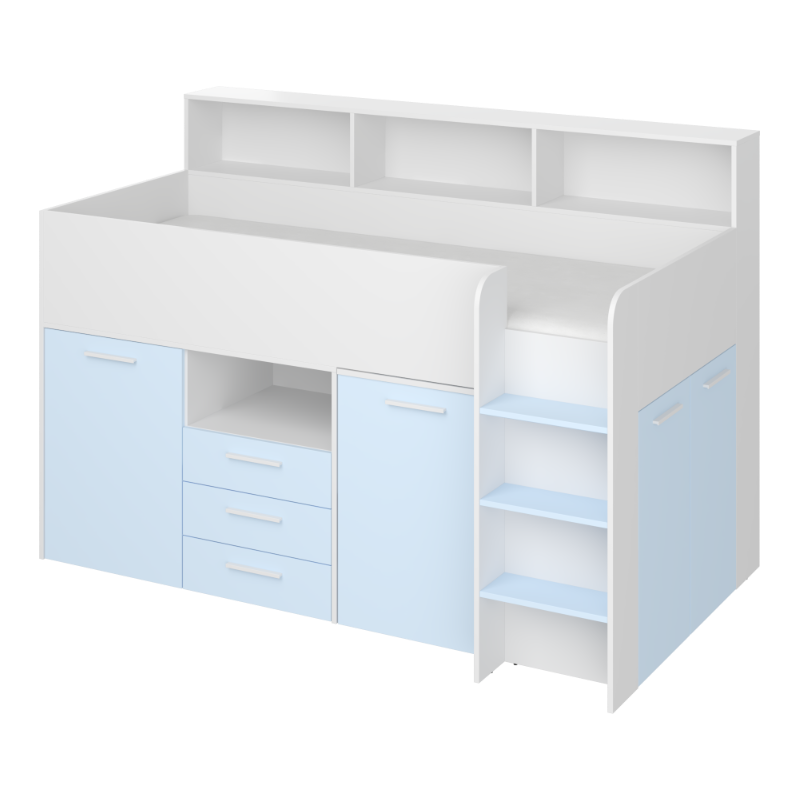 Antresola Neo P w wersji Biały/Błękit to niskie, prawostronne łóżko piętrowe o powierzchni spania 80 na 200 cm oraz wymiarach całkowitych: długość 206 cm, wysokość 138 cm i głębokość 120 cm. Wykonane z wysokiej jakości płyty laminowanej o grubości 16 mm, z obrzeżami ABS zwiększającymi odporność na wilgoć i uszkodzenia mechaniczne. Mebel wyposażono w zawiasy z cichym domykiem, co podnosi komfort użytkowania. Bezpieczna metalowa drabinka po prawej stronie zapewnia łatwy dostęp do łóżka. Funkcjonalne wyposażenie obejmuje wysuwane biurko z dwiema szufladami i czterema półkami, cztery otwarte półki, pojedynczą szafkę z dwiema półkami oraz podwójną szafkę z trzema półkami, które pomagają utrzymać porządek w pokoju. Neo P Biały/Błękit to doskonałe rozwiązanie dla każdego dziecka, które ceni wygodę i funkcjonalność.