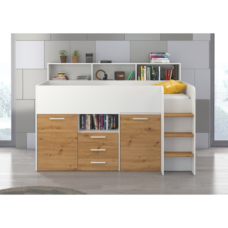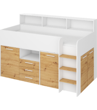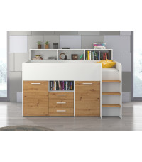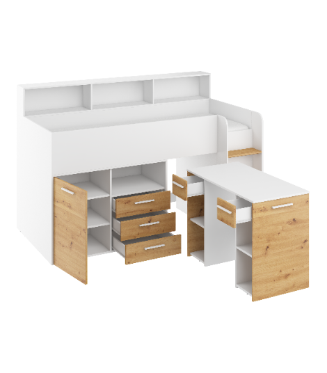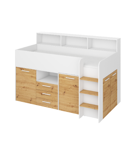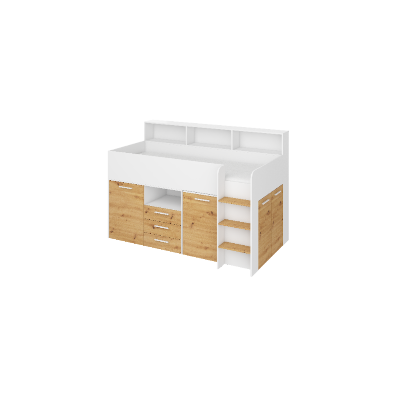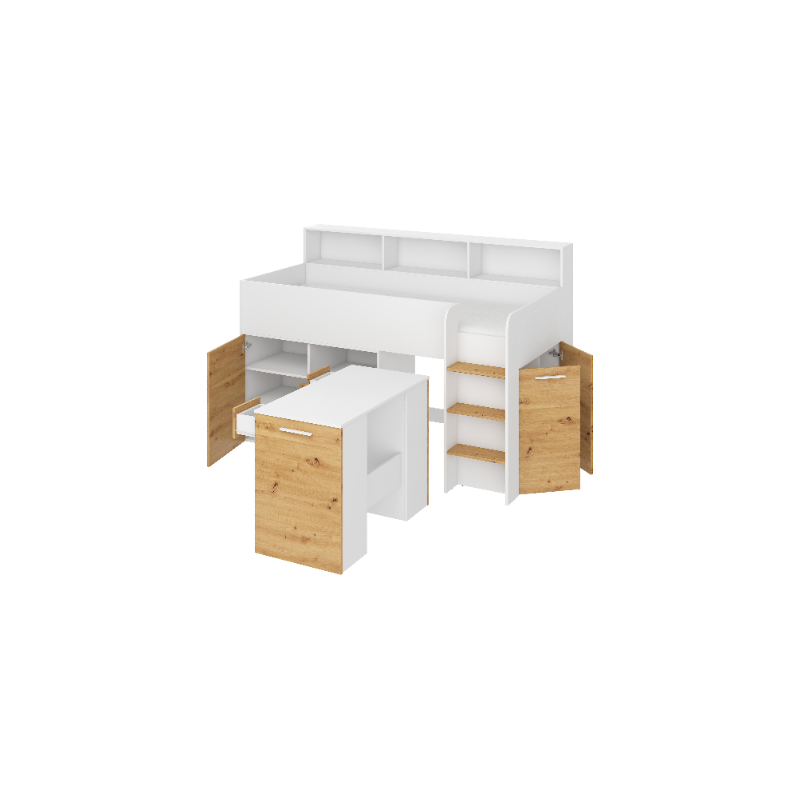 Antresola Neo P w wersji Biały/Dąb Artisan to niskie, prawostronne łóżko piętrowe o powierzchni spania 80 na 200 cm oraz wymiarach całkowitych: długość 206 cm, wysokość 138 cm i głębokość 120 cm. Konstrukcja wykonana z wysokiej jakości płyty laminowanej o grubości 16 mm, z obrzeżami ABS, które zwiększają odporność na wilgoć i uszkodzenia mechaniczne. Zawiasy z cichym domykiem podnoszą komfort codziennego użytkowania. Metalowa drabinka po prawej stronie zapewnia bezpieczny dostęp do łóżka. Wysuwane biurko z dwoma szufladami i czterema półkami tworzy wygodne miejsce do nauki i zabawy. Cztery otwarte półki, pojedyncza szafka z dwiema półkami oraz podwójna szafka z trzema półkami zapewniają dużo przestrzeni do przechowywania. Neo P Biały/Dąb Artisan to idealne połączenie funkcjonalności i naturalnego designu.