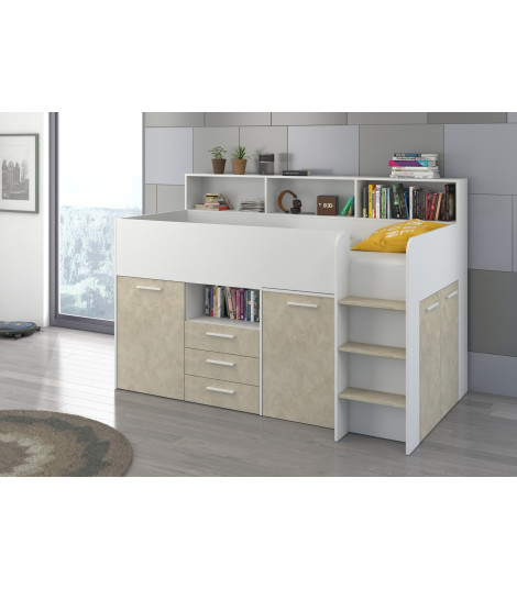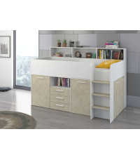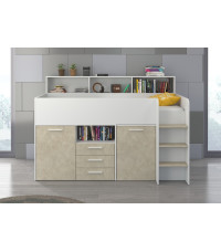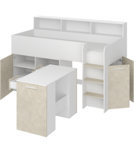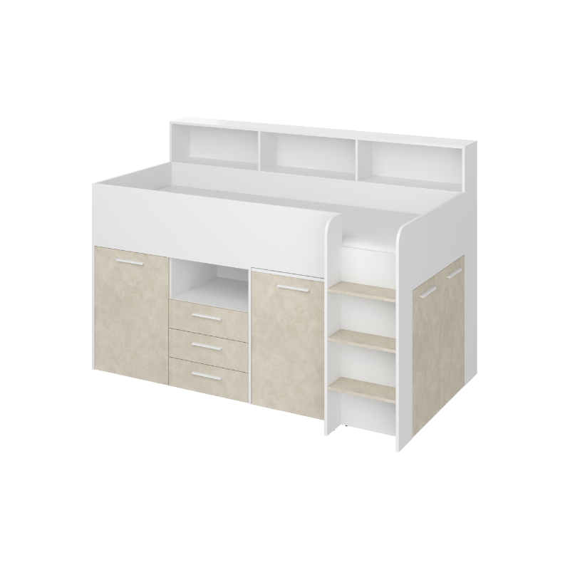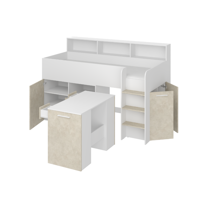 Antresola Neo P w wersji Biały/Granada Migdał to niskie, prawostronne łóżko piętrowe o powierzchni spania 80 na 200 cm oraz wymiarach całkowitych: długość 206 cm, wysokość 138 cm i głębokość 120 cm. Wykonane z wysokiej jakości płyty laminowanej o grubości 16 mm, z obrzeżami ABS, które zwiększają odporność mebla na wilgoć i uszkodzenia mechaniczne. Zawiasy z cichym domykiem poprawiają komfort codziennego użytkowania. Metalowa drabinka po prawej stronie zapewnia bezpieczny dostęp do łóżka. Wysuwane biurko wyposażone w dwie szuflady i cztery półki oferuje wygodne miejsce do nauki. Dodatkowo cztery otwarte półki, pojedyncza szafka z dwiema półkami oraz podwójna szafka z trzema półkami zapewniają dużo przestrzeni do przechowywania. Neo P Biały/Granada Migdał łączy funkcjonalność z eleganckim designem.