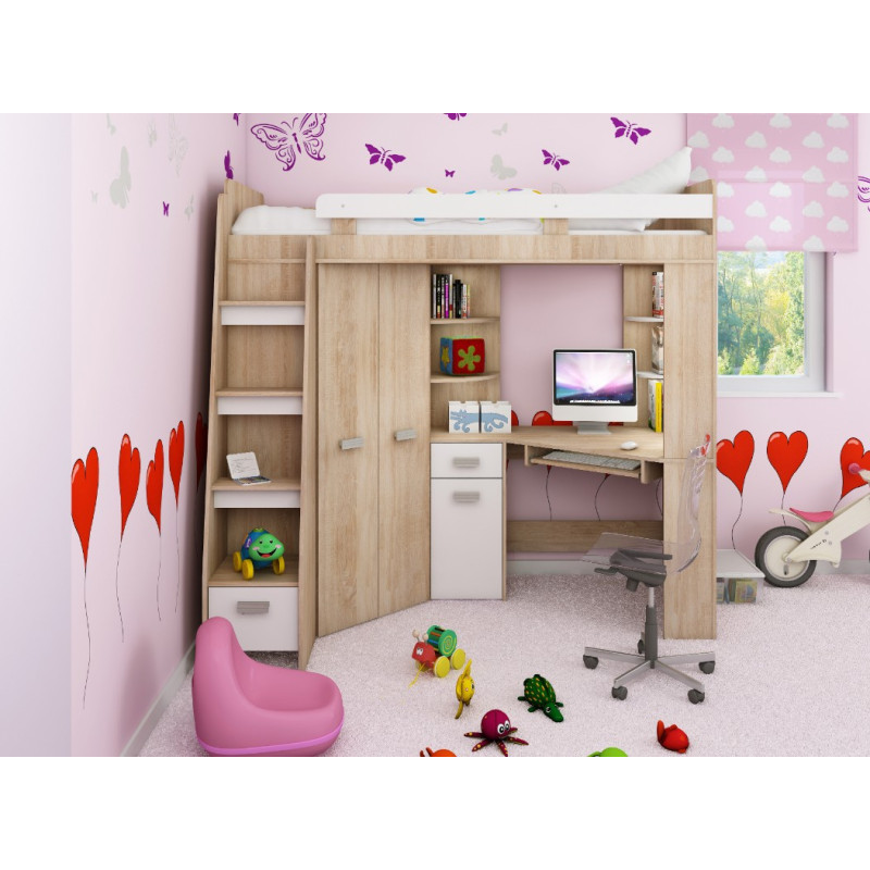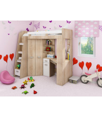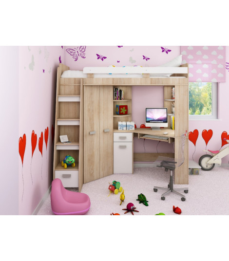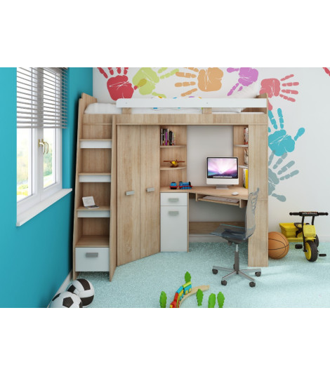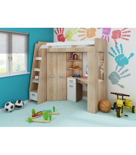 Łóżko piętrowe Antresola L z biurkiem i szafą Sonoma jasna/Biały