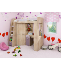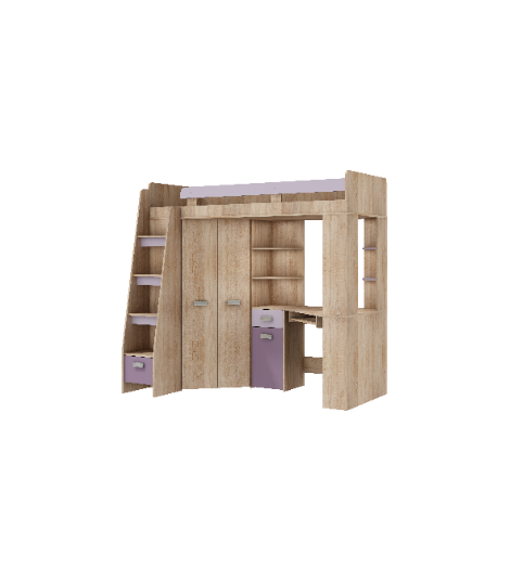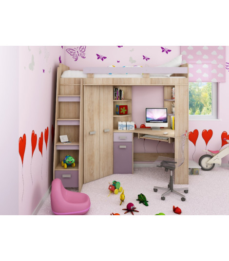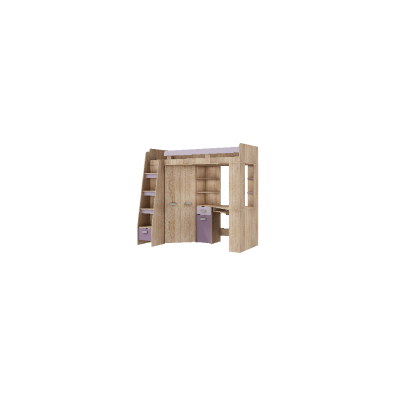 Łóżko piętrowe Antresola L z biurkiem i szafą Sonoma jasna/Lawenda/Fiolet