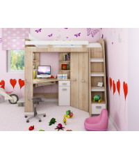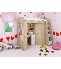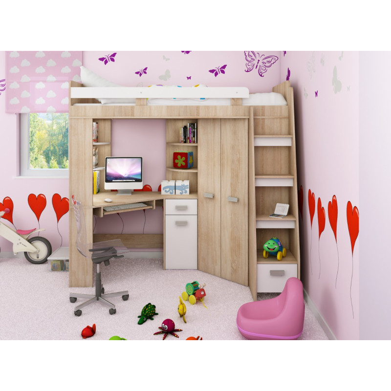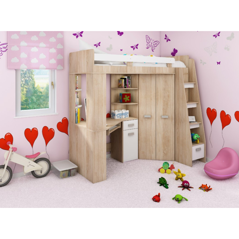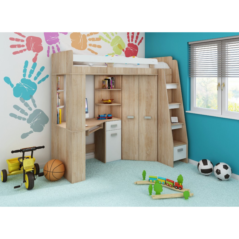 Antresola P Sonoma Jasna / Biały to jasny i funkcjonalny zestaw dziecięcy w wersji prawostronnej, który łączy łóżko, biurko oraz narożną szafę. Idealny wybór, aby stworzyć przytulne i praktyczne miejsce do nauki i wypoczynku nawet w mniejszych pokojach.