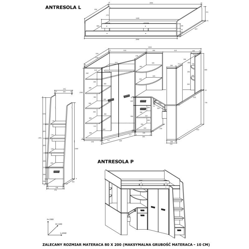 Antresola P Sonoma Jasna / Biały o wymiarach: długość 204 cm, wysokość 190 cm, głębokość 120 cm została zaprojektowana z myślą o maksymalnym wykorzystaniu przestrzeni w pokoju dziecka. Zestaw obejmuje łóżko z barierką zabezpieczającą przed wypadnięciem, narożną szafę z czterema półkami, masywnymi uchwytami i drążkiem do zawieszania ubrań oraz narożny stolik pod komputer wyposażony w szafkę, szufladę i wysuwaną półkę na klawiaturę. Cztery narożne półki na słupkach podtrzymujących łóżko oferują dodatkową przestrzeń do przechowywania. Do łóżka prowadzą szerokie, stabilne stopnie umieszczone po prawej stronie, a pod dolnym stopniem znajduje się praktyczny schowek. Łóżko dostarczane jest bez materaca i siatki; zalecany materac ma wymiary 200x80 cm i wysokość 10 cm, co zapewnia bezpieczeństwo użytkowania barierki.