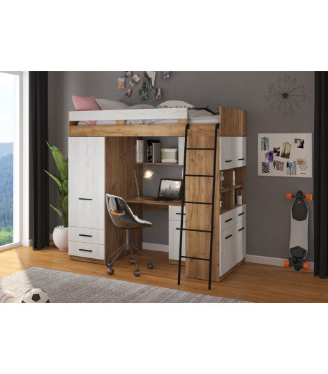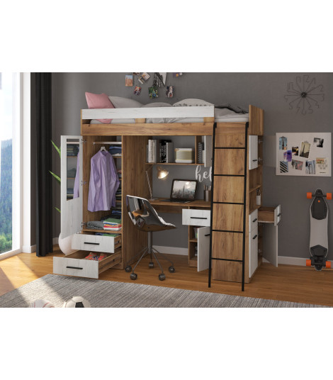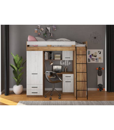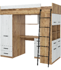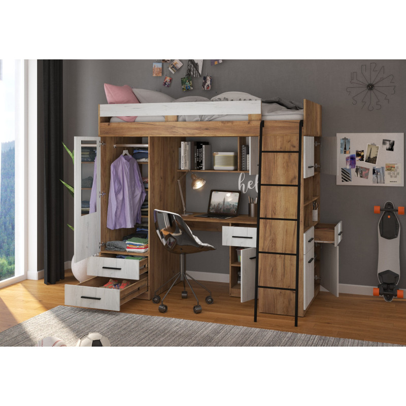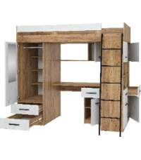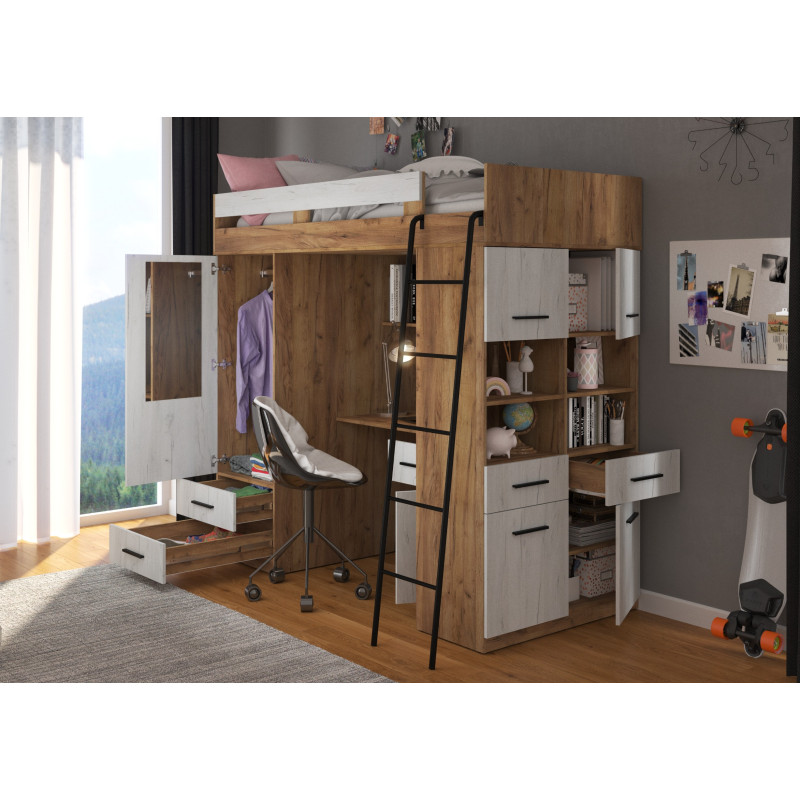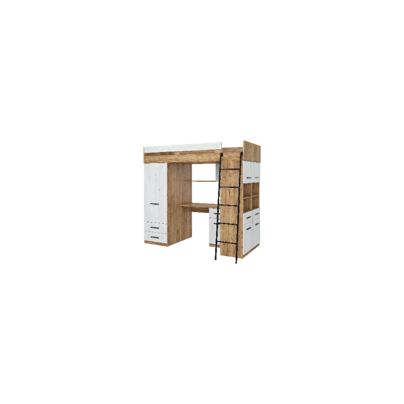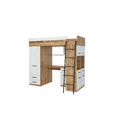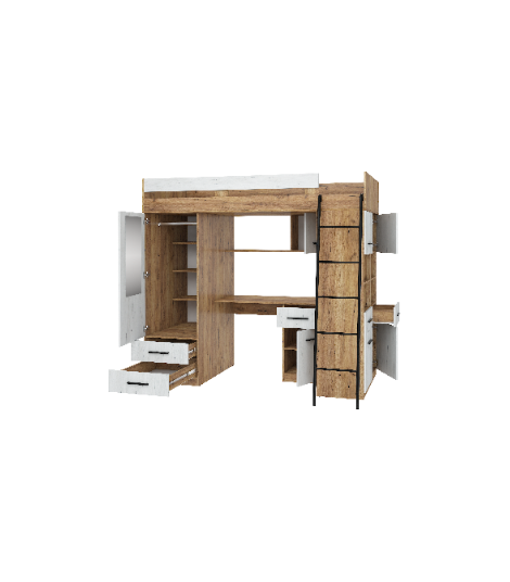 Antresola Level P w odcieniach Craft Złoty i Craft Biały to propozycja dla tych, którzy cenią ciepłe, naturalne barwy i nowoczesny design. Wielofunkcyjna konstrukcja łączy łóżko, biurko, szafę i regał, tworząc komfortową i stylową przestrzeń w jednym meblu.