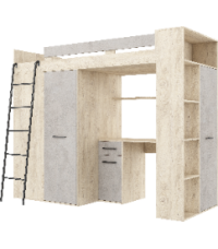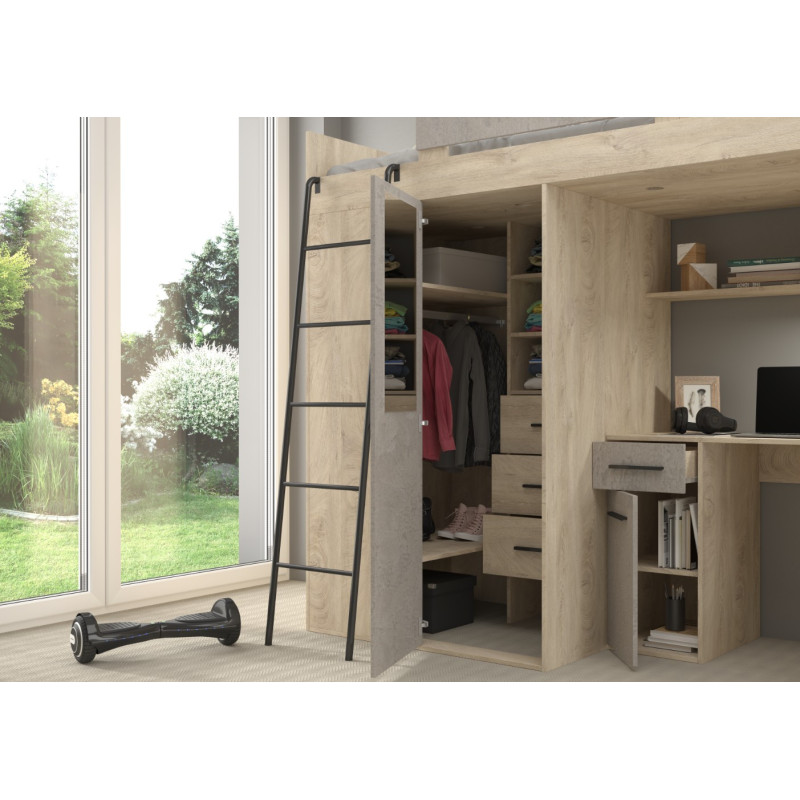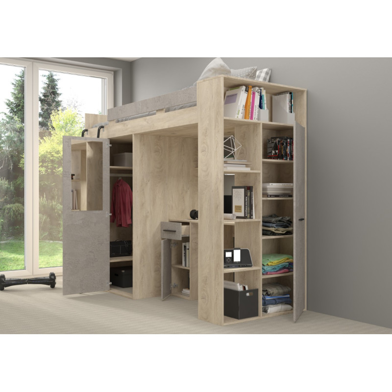 Łóżko piętrowe Verana L z biurkiem i szafą Dąb Endgrain/Beton szary