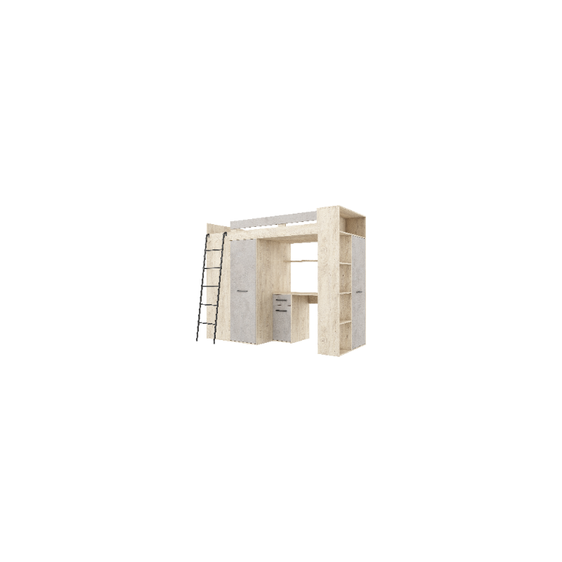 Verana L w zestawieniu Dąb Endgrain i Beton szary to stylowe i funkcjonalne łóżko piętrowe, które łączy miejsce do spania, nauki i przechowywania w jednej kompaktowej formie. Idealne do nowoczesnych pokojów dziecięcych.