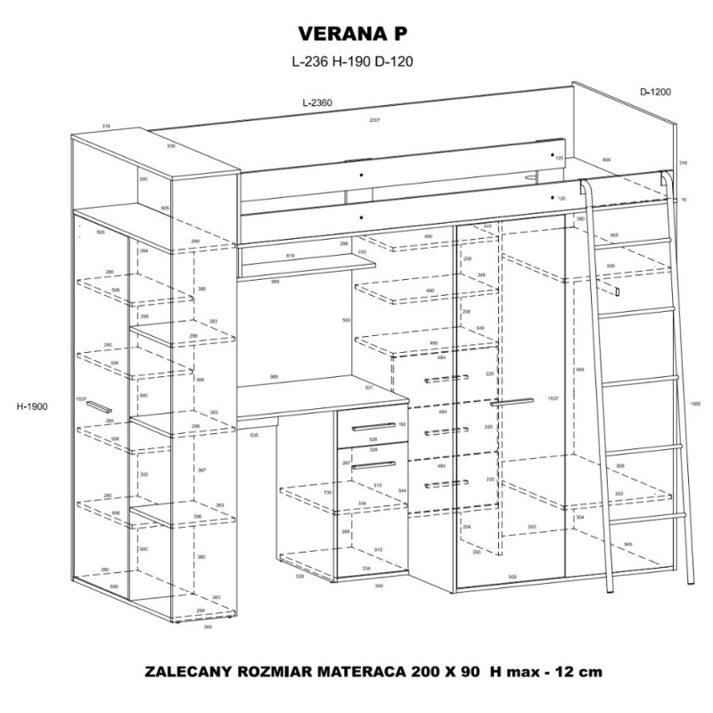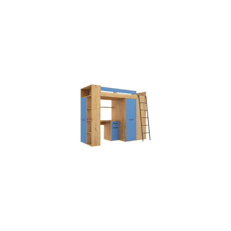 Łóżko piętrowe Verana P w kolorystyce Dąb Artisan / Niebieski to wielofunkcyjny mebel zaprojektowany z myślą o maksymalnym wykorzystaniu przestrzeni w pokoju dziecka. W zestawie znajduje się miejsce do spania o wymiarach 90 × 200 cm (materac nie jest dołączony), funkcjonalne biurko z szafką i szufladą, pojemna szafa z drążkiem, półkami, szufladami oraz lustrem, a także boczny regał z bieliźniarką. Konstrukcja została wykonana z płyty laminowanej o grubości 16 mm, a jej krawędzie zabezpieczono obrzeżem ABS, co zwiększa odporność na wilgoć i uszkodzenia. Zastosowane zawiasy z cichym domykiem podnoszą komfort codziennego użytkowania. Stabilna, metalowa drabinka umieszczona po prawej stronie zapewnia bezpieczny dostęp do górnego łóżka. Wymiary całkowite mebla to: długość 236 cm, wysokość 190 cm oraz głębokość 130 cm. Verana P Dąb Artisan / Niebieski to doskonały wybór do nowoczesnych i dobrze zorganizowanych dziecięcych wnętrz.