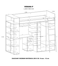 Łóżko piętrowe Verana P w wersji Sonoma jasna / Fiolet to funkcjonalny mebel, który pozwala optymalnie wykorzystać przestrzeń w pokoju dziecięcym. Wyposażone jest w miejsce do spania o wymiarach 90 × 200 cm (materac nie jest dołączony), pojemną szafę z lustrem, drążkiem, półkami i szufladami, biurko z szafką i szufladą oraz boczny regał z bieliźniarką. Konstrukcja wykonana jest z trwałej płyty laminowanej o grubości 16 mm, a jej obrzeża zabezpieczono odpornym na wilgoć i uszkodzenia tworzywem ABS. Zawiasy z cichym domykiem podnoszą komfort użytkowania mebla na co dzień. Metalowa drabinka zamontowana jest po prawej stronie, zapewniając bezpieczny dostęp do górnego łóżka. Wymiary całkowite łóżka to: długość 236 cm, wysokość 190 cm oraz głębokość 130 cm. Verana P Sonoma jasna / Fiolet to doskonałe połączenie funkcjonalności i nowoczesnego designu z kolorowym akcentem.