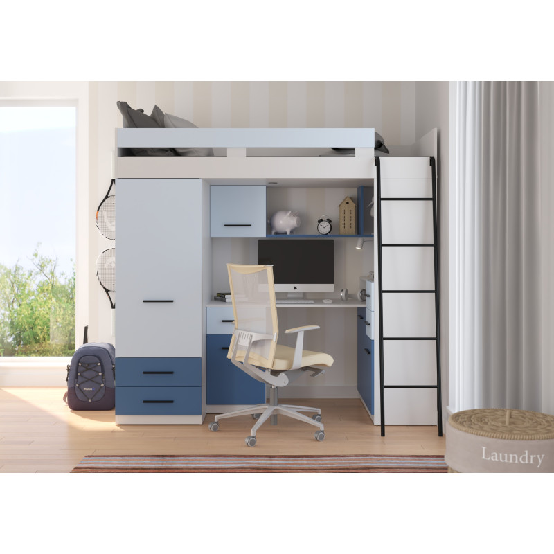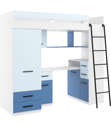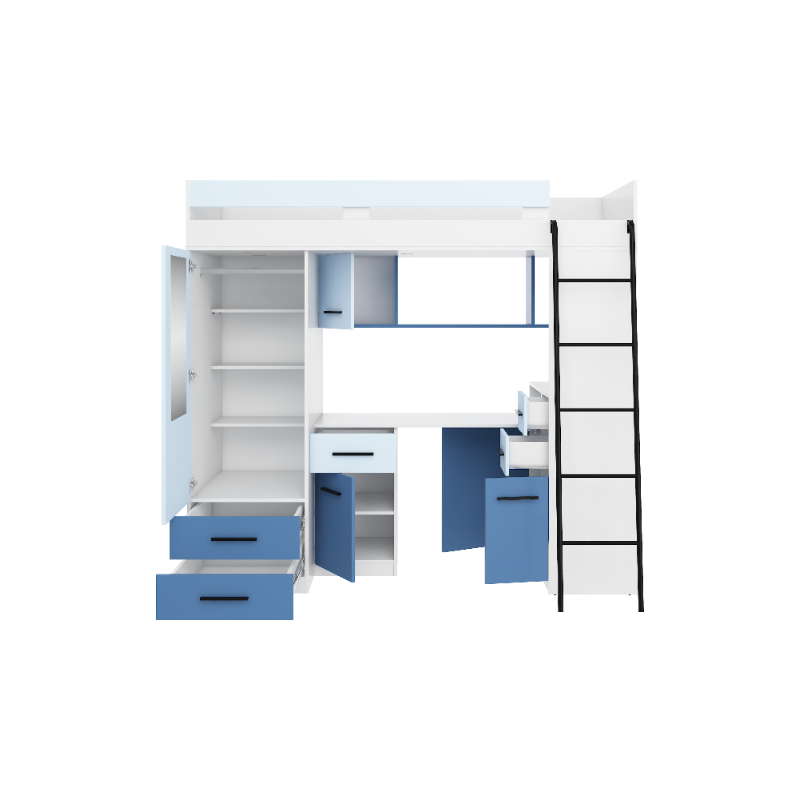 Antresola Smyk P w wersji Biały/Błękit/Niebieski to praktyczne łóżko piętrowe o prawostronnym układzie, które pozwala efektywnie wykorzystać przestrzeń w pokoju dziecka. Powierzchnia do spania ma wymiary 80 na 200 cm, a całkowite wymiary mebla to długość 204 cm, wysokość 188 cm oraz głębokość 120 cm. Konstrukcja wykonana jest z trwałej płyty laminowanej o grubości 16 mm, z obrzeżami zabezpieczonymi odpornym tworzywem ABS. Mebel wyposażono w metalową drabinkę po prawej stronie, zapewniającą bezpieczny dostęp do górnego łóżka, pojemną szafę z półkami, drążkiem i dwiema szufladami oraz biurko z zamykaną szafką i szufladą, które zapewniają komfortową przestrzeń do nauki. Dodatkowo regał z zamykanymi szafkami pomaga utrzymać porządek w pokoju. Cichy domyk oraz certyfikat bezpieczeństwa zwiększają wygodę i pewność użytkowania. Smyk P Biały/Błękit/Niebieski to doskonałe połączenie funkcjonalności i nowoczesnego designu.
