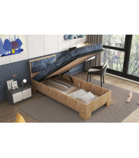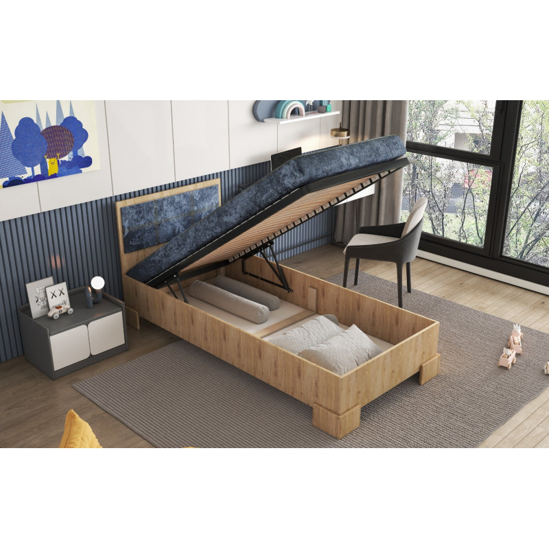 Łóżko DEKO o wymiarach spania 90×200 cm wykonane jest z płyty laminowanej, co czyni je trwałym i łatwym w utrzymaniu w czystości. Pod materacem znajduje się pojemnik na pościel, który pozwala na praktyczne przechowywanie pościeli i innych rzeczy. Do zagłówka został przymocowany tapicerowany element, co zapewnia wygodne oparcie podczas czytania książki czy oglądania telewizji. Pokrowiec materaca wykonany jest z tkaniny w kolorze zagłówka, nadaje to łóżku spójny wygląd i harmonijnie komponuje się z całością. Łóżko wyróżnia się eleganckim designem i idealnie wpasuje się w nowoczesne wnętrza sypialni. Pojemnik na pościel został wyposażony w sprężyny, dzięki którym chowanie pościeli jest bardzo łatwe.