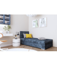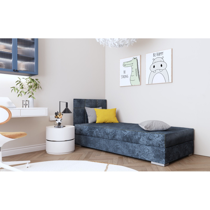Łóżko tapicerowane z pojemnikiem na pościel SINTRA I o wymiarach powierzchni spania 90/200 cm posiada wykończenie zrobione z tkaniny. Takie rozwiązanie sprawia, że łóżko jest zarówno wygodne do spania, jak i praktyczne w codziennym użytkowaniu. Tapicerka z tkaniny dodaje łóżku eleganckiego wyglądu. Wymiary powierzchni spania 90/200 cm są odpowiednie dla jednej osoby, co czyni to łóżko idealnym do małych sypialni lub dla osób, które potrzebują miejsca do spania, ale nie mają zbyt wiele miejsca w pokoju. Pokrowiec materaca wykonany z tkaniny zapewnia dodatkowy komfort podczas snu. Pojemnik na pościel został wyposażony w sprężyny, dzięki którym chowanie pościeli jest bardzo łatwe.