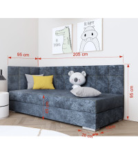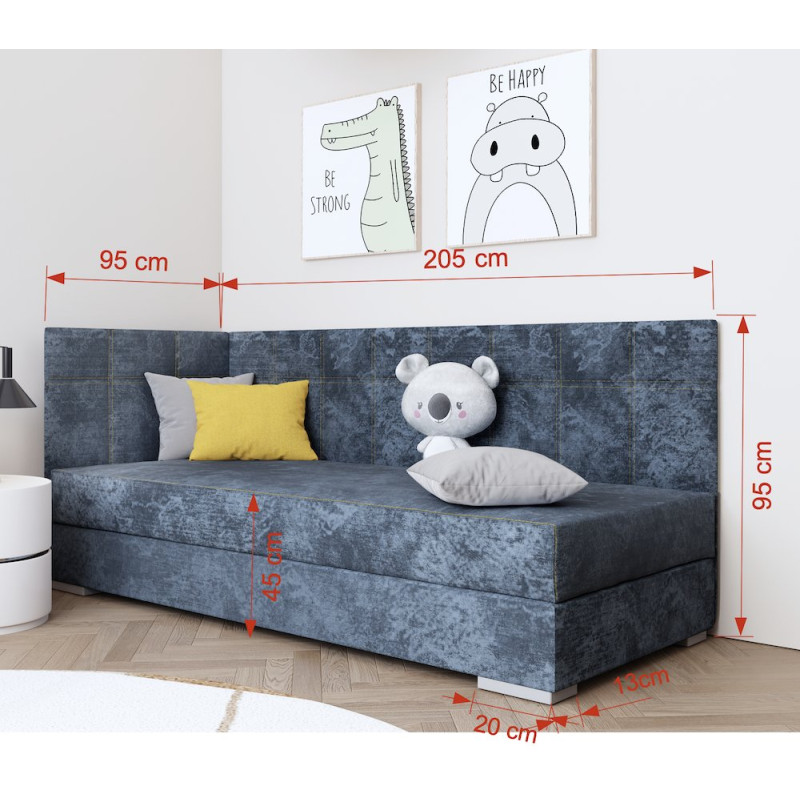Łóżko tapicerowane z pojemnikiem na pościel SINTRA III o wymiarach powierzchni spania 90/200 cm posiada wykończenie zrobione z tkaniny. Takie rozwiązanie sprawia, że łóżko jest zarówno wygodne do spania, jak i praktyczne w codziennym użytkowaniu. Tapicerka z tkaniny dodaje łóżku eleganckiego wyglądu. Wymiary powierzchni spania 90/200 cm są odpowiednie dla jednej osoby, co czyni to łóżko idealnym do małych sypialni lub dla osób, które potrzebują miejsca do spania, ale nie mają zbyt wiele miejsca w pokoju. Pokrowiec materaca wykonany z tkaniny zapewnia dodatkowy komfort podczas snu. Pojemnik na pościel został wyposażony w sprężyny, dzięki którym chowanie pościeli jest bardzo łatwe.