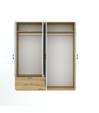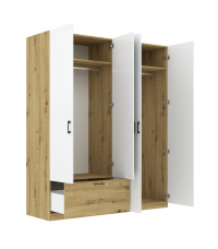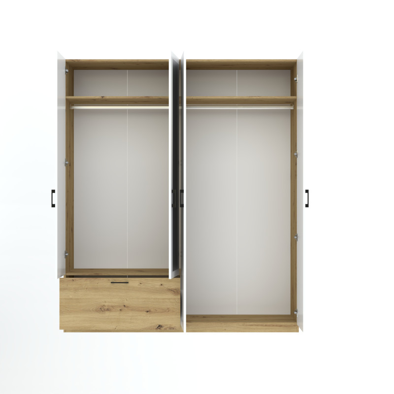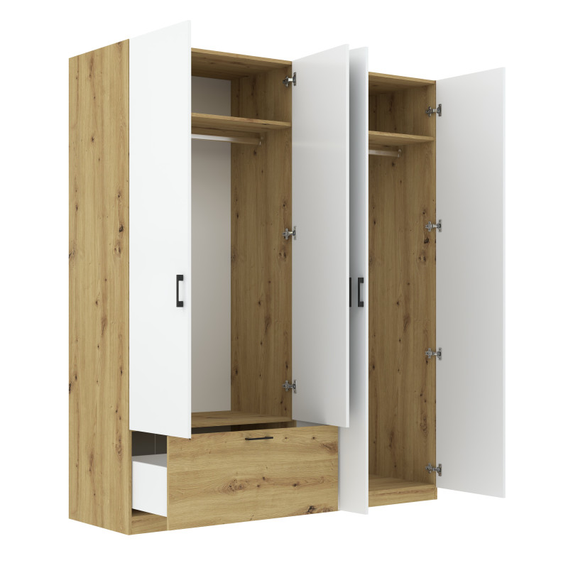 Szafa ALTA 4D1S w wersji bez lustra mierzy 179,6 cm szerokości, 54 cm głębokości i 210 cm wysokości — idealna do mniejszych sypialni, garderób czy przedpokojów. Front i korpus wykonano z płyty laminowanej 16 mm — odpowiednio biały i dąb artisan — a tył to solidna płyta HDF na wręgę, z papierowym obrzeżem. Wnętrze zawiera półkę, drążek i szufladę (45 × 20 × 12 cm) na prowadnicach kulkowych, co zapewnia wygodę i trwałość. Czarny uchwyt z tworzywa i minimalistyczne ślizgacze dodają całości lekkości, a metalowe zawiasy dbają o niezawodne działanie przez lata.