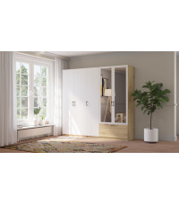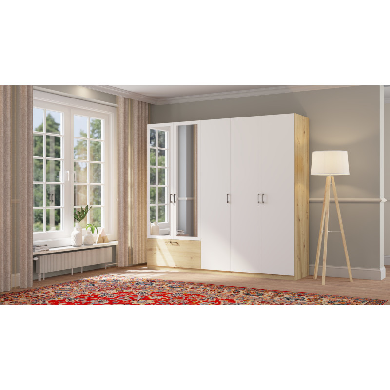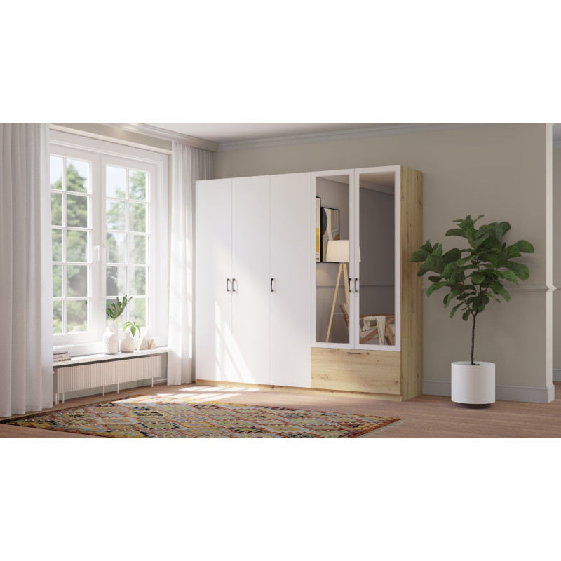 Szafa ALTA 5D1S z dwoma lustrami w kolorze Artisan/Biały to elegancki mebel, który łączy funkcjonalność z nowoczesnym stylem. Posiada pięć drzwi, w tym dwa duże lustra, które optycznie powiększają przestrzeń i dodają elegancji wnętrzu. Przestronne wnętrze oferuje wystarczająco dużo miejsca na przechowywanie odzieży, butów oraz innych akcesoriów. Połączenie bieli z ciepłym odcieniem drewna wprowadza do pomieszczenia przytulny, a zarazem nowoczesny charakter. Idealna do sypialni, przedpokoju czy garderoby, zapewniając porządek oraz estetyczny wygląd.