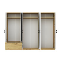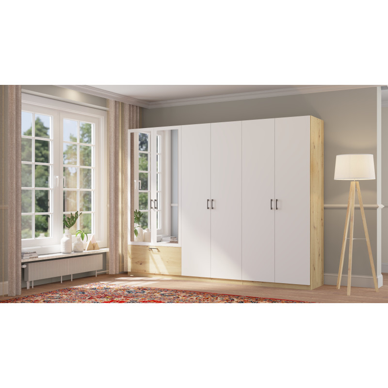 Szafa ALTA 6D1S w eleganckim kolorze drewna to doskonałe połączenie nowoczesnego designu i funkcjonalności, idealna do każdego wnętrza. Wykonana z płyty laminowanej o grubości 16 mm, korpus w ciepłym odcieniu dębu artisan doskonale komponuje się z białymi frontami, tworząc harmonijną i stylową całość. Szafa posiada dwa drążki oraz dwie półki za frontami, co zapewnia przestronną i uporządkowaną przestrzeń do przechowywania odzieży i innych przedmiotów. Lustrzane fronty dodają elegancji, a ich połysk optycznie powiększa przestrzeń. Zawiasy metalowe oraz uchwyty tworzywowe w kolorze czarnym zapewniają wygodę użytkowania i estetyczny wygląd.