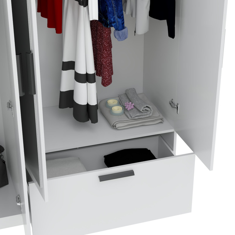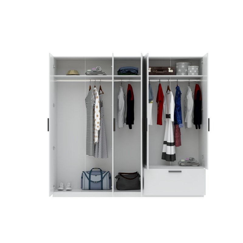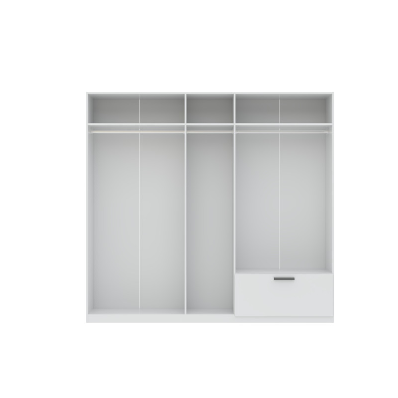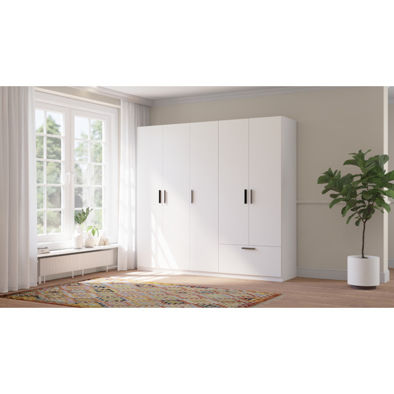 Szafa LITA 5D1S w kolorze białym to elegancka i przestronna opcja do przechowywania. Z pięcioma szerokimi drzwiami i praktycznym wnętrzem, zapewnia mnóstwo miejsca na ubrania, obuwie i akcesoria. Dzięki prostemu, nowoczesnemu designowi, doskonale wpisuje się w różnorodne aranżacje wnętrz. Solidne wykonanie z wysokiej jakości materiałów gwarantuje trwałość, a klasyczny biały kolor wprowadza świeżość i harmonię do każdej przestrzeni. Idealna do sypialni, przedpokoju czy garderoby.