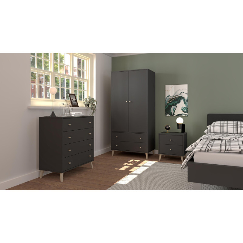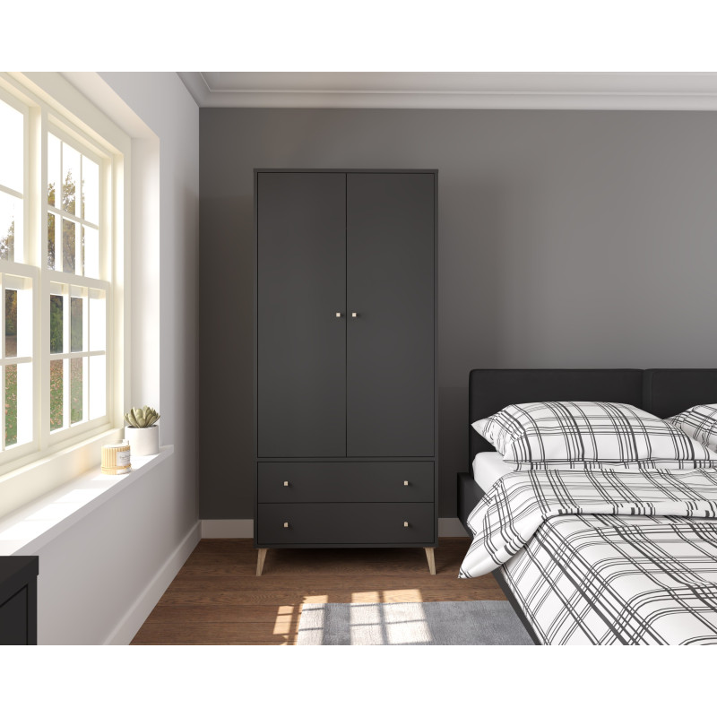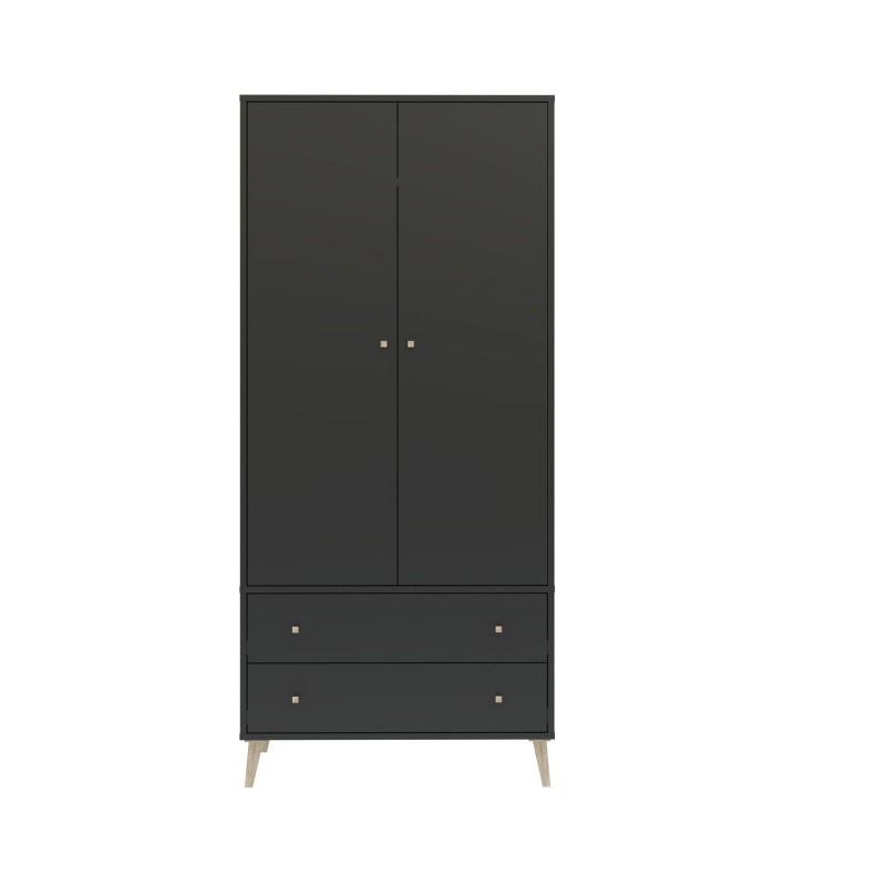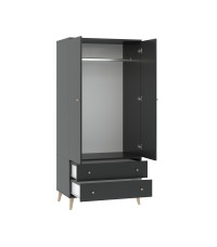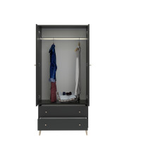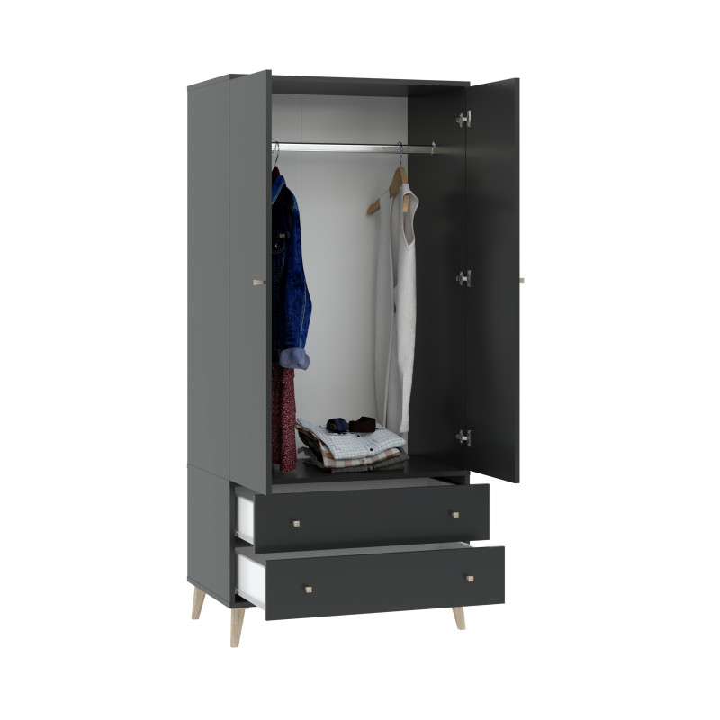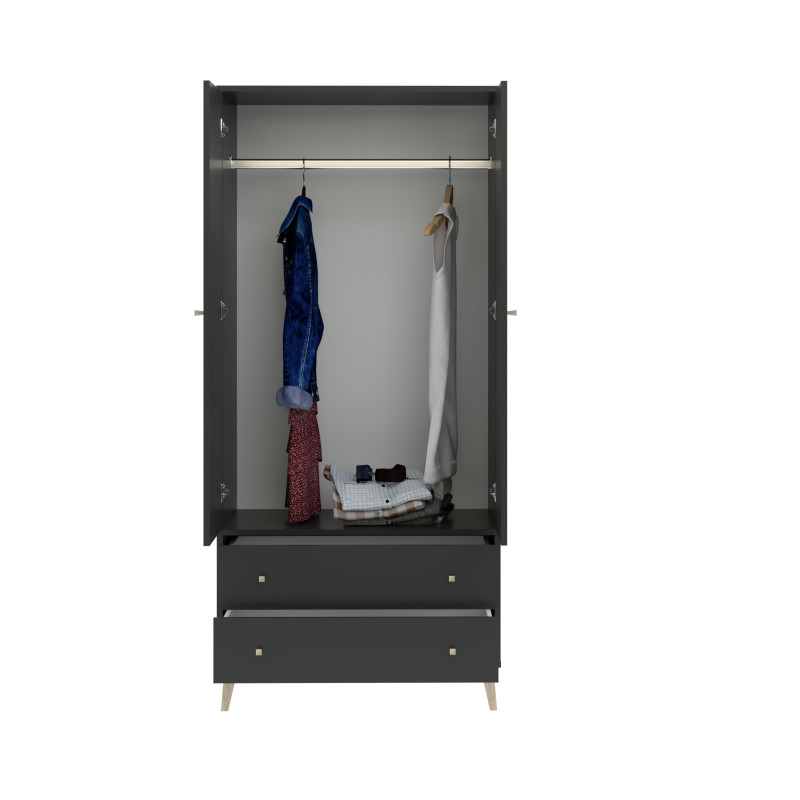 Szafa SALFORD w kolorze antracytu łączy nowoczesną formę z praktyczną funkcją przechowywania. Wyposażona w drążek, półki i dwie szuflady, pomoże utrzymać porządek w każdej sypialni lub przedpokoju. Jej głęboki kolor dodaje wnętrzu elegancji i wyjątkowego charakteru.