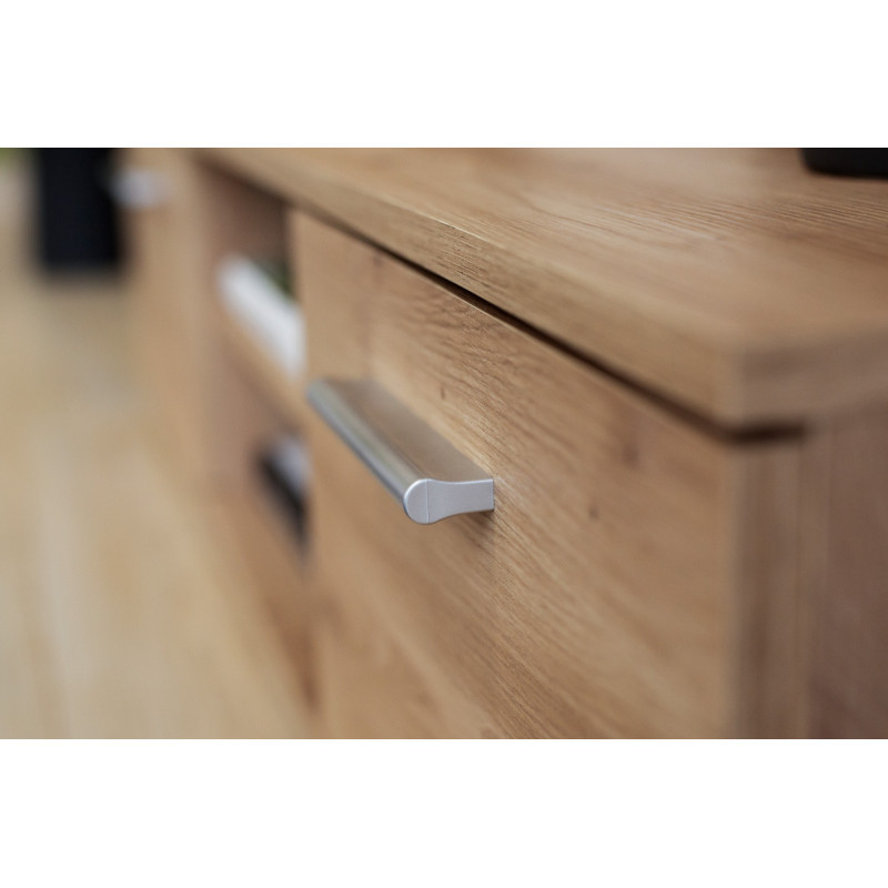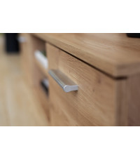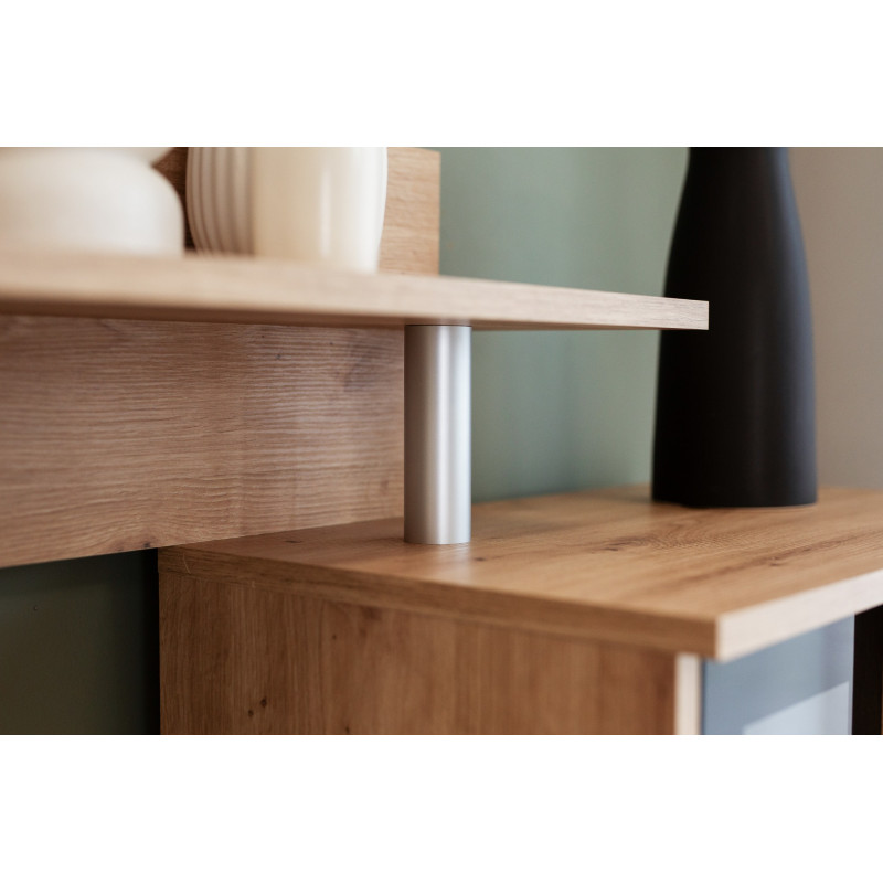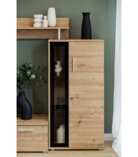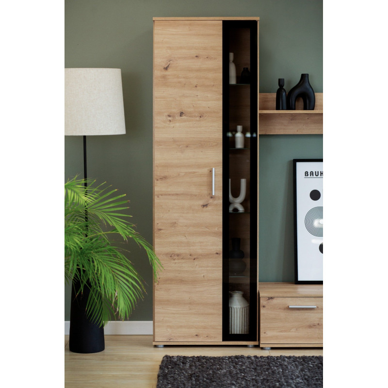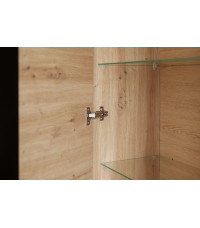 Meblościanka Bentley w kolorystyce dąb artisan / czarny to kompletny zestaw mebli, który nada wnętrzu charakteru i zapewni maksymalną funkcjonalność. Zestaw składa się z wysokiej witryny jednodrzwiowej o wymiarach szerokość 59 cm, wysokość 183 cm i głębokość 34 cm, niskiej witryny jednodrzwiowej o szerokości 59 cm, wysokości 118 cm i głębokości 34 cm, szafki RTV o szerokości 138 cm, wysokości 31 cm i głębokości 40 cm oraz półki wiszącej o szerokości 160 cm, wysokości 24 cm i głębokości 22 cm. Wysoka witryna została wyposażona w cztery szklane półki, a niska w dwie, co pozwala na elegancką ekspozycję dekoracji lub szkła. Szafka RTV posiada dwie uchylne klapy oraz dwie otwarte wnęki, dzięki czemu pomieści sprzęt multimedialny i akcesoria. Meble wykonano z płyty laminowanej o wysokiej odporności, zabezpieczonej obrzeżem ABS, natomiast uchwyty w kolorze chrom mat dopełniają całości nowoczesnym akcentem. Połączenie naturalnego dekoru dąb artisan z czernią sprawia, że meblościanka świetnie wpasuje się zarówno w aranżacje nowoczesne, jak i loftowe.