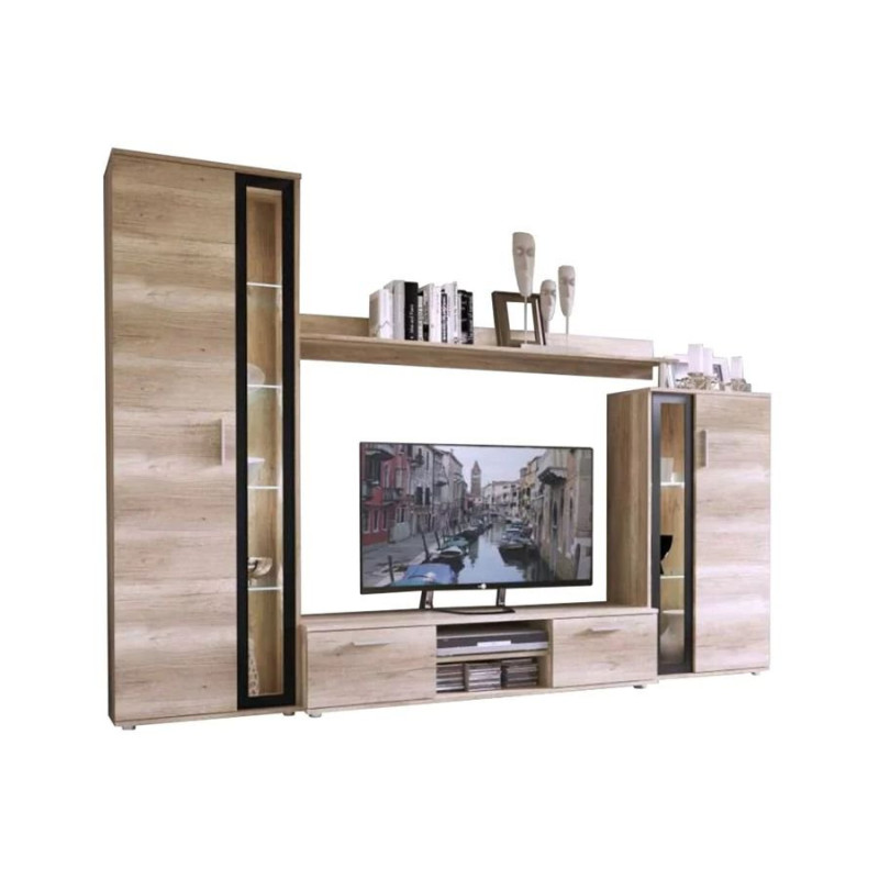 Meblościanka Bentley w wybarwieniu Country oak grey z czarnymi detalami to harmonijne połączenie nowoczesnego designu i naturalnego charakteru drewna. To praktyczny zestaw, który nada salonowi wyjątkowego stylu i elegancji.